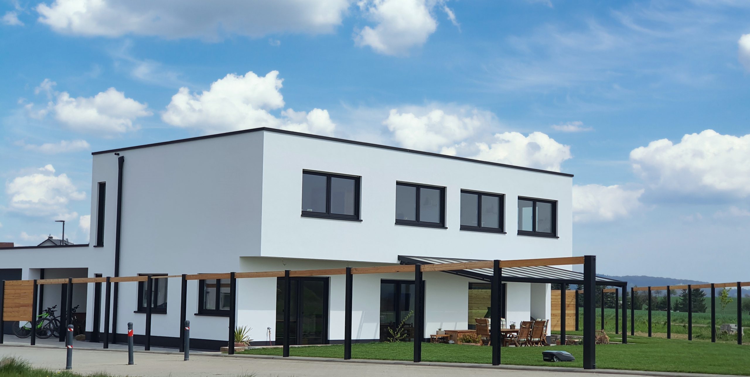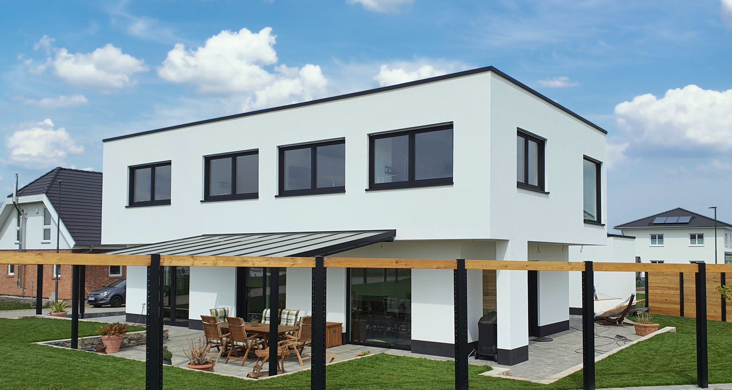 Unser Leistungsumfang beinhaltet hier die komplette Gebäudehülle ab Oberkante Bodenplatte incl. Dacheindeckung, Fenster- und Rollladenanlage, Außenputz sowie den kompletten Trockenbau nach Einbau der bauseits erstellten Haustechnik.