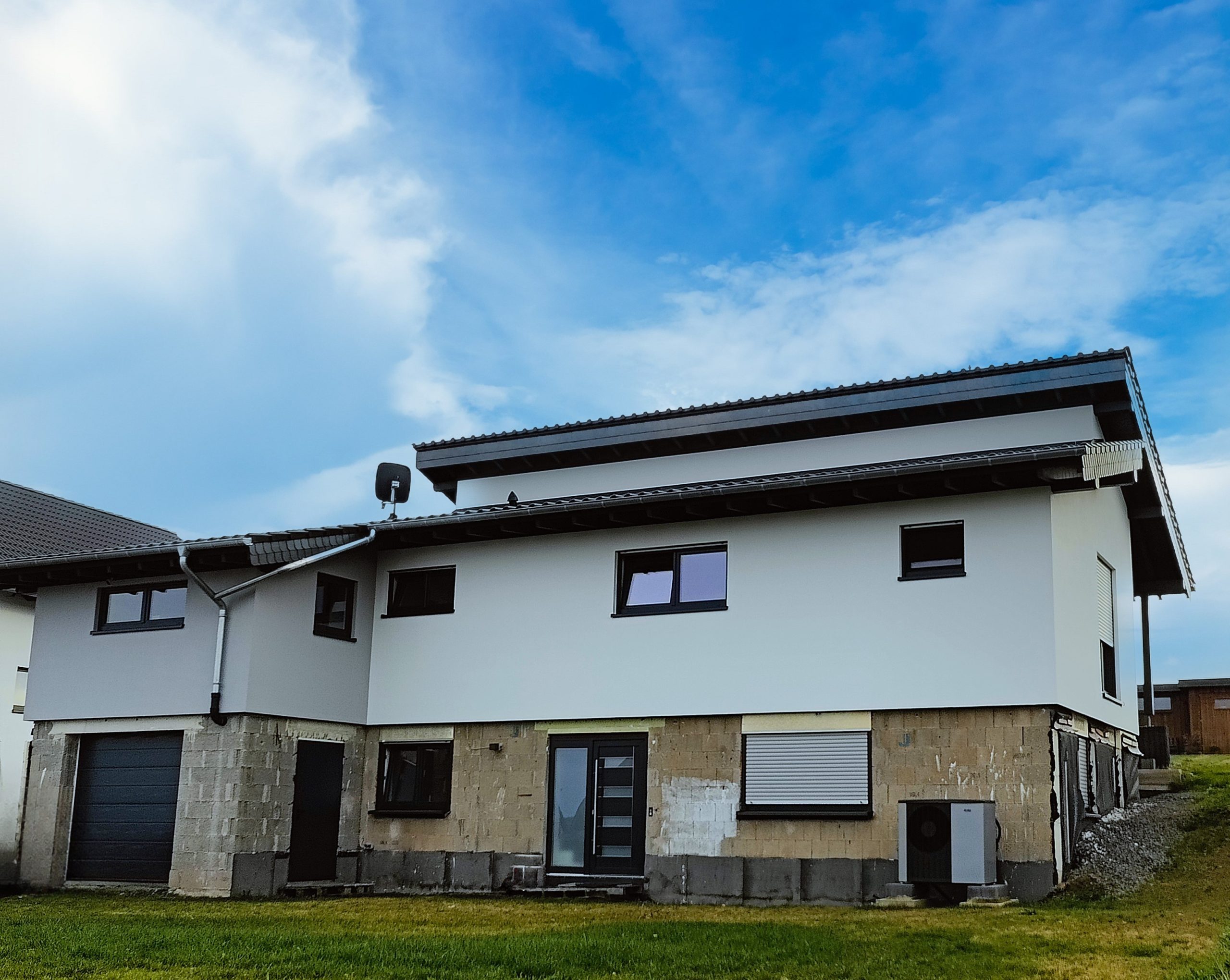 Wir liefern hier die komplette Gebäudehülle incl. Fensteranlage und Putzfassade. Die Dämmarbeiten der Dachebene, der Installationsebene sowie der Innenwände führt der Bauherr ebenfalls in Eigenleistung aus.