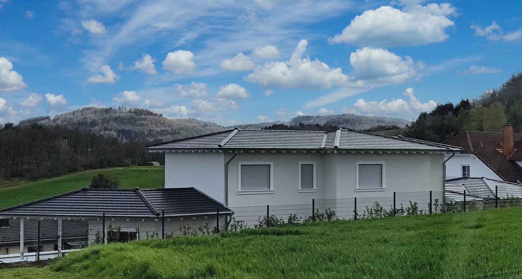 Die Außenoptik wird als Putzfassade mit schwarzen Kunststoff-Fenstern erstellt. Die Dacheindeckung erfolgt mit einem hochwertigen Tonziegel unseres langjährigen Partner Creaton.