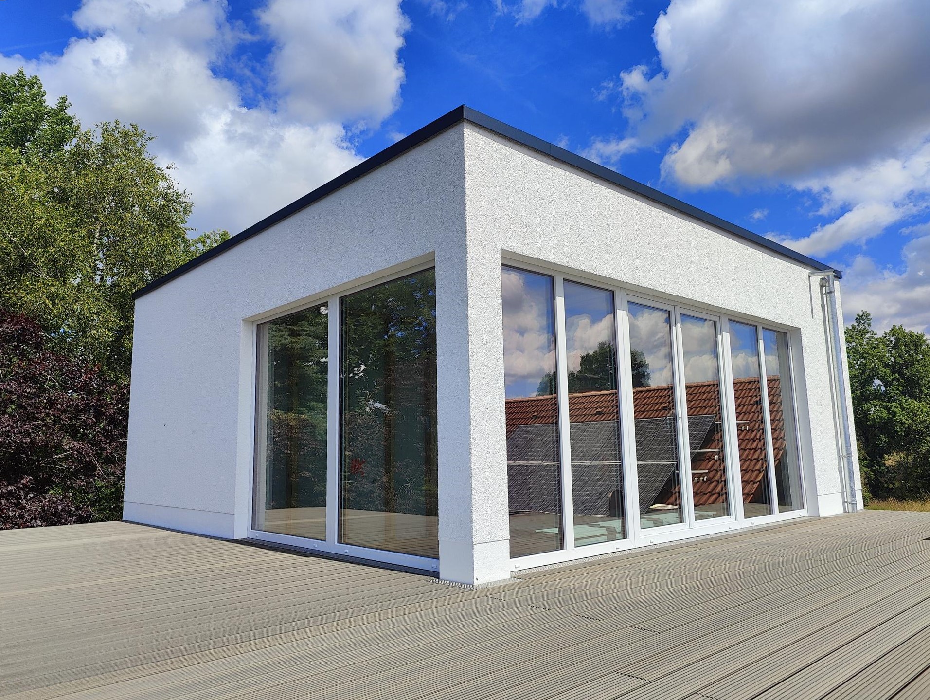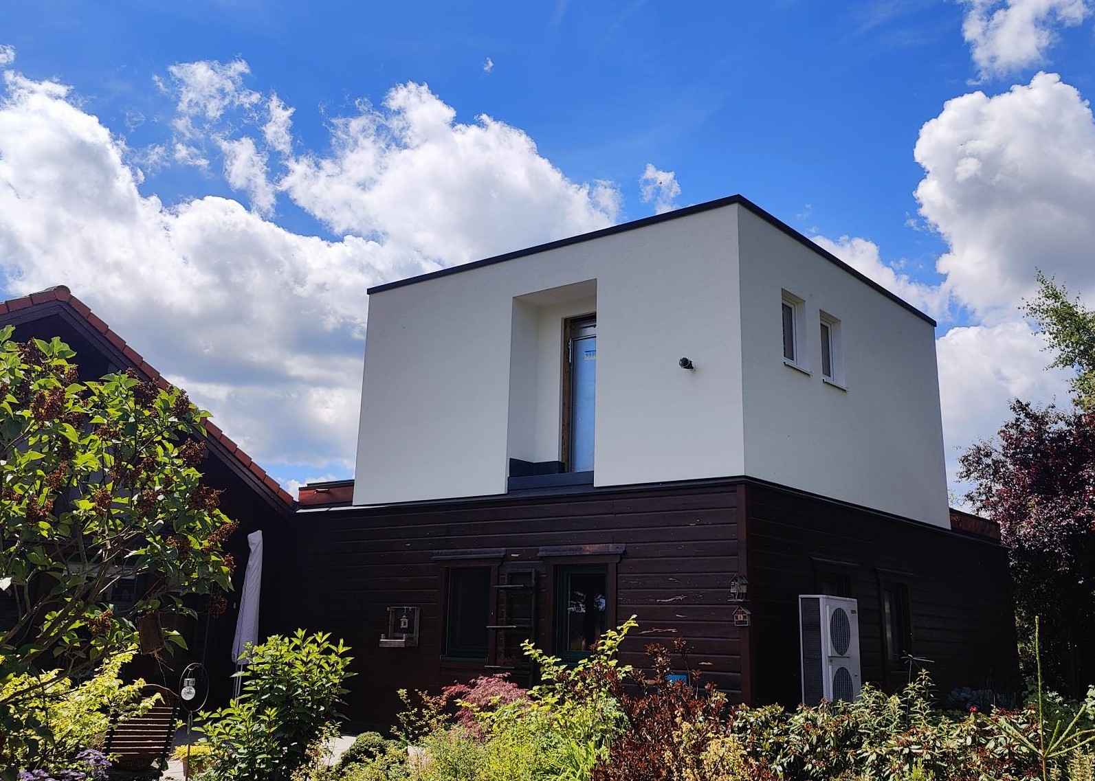 Die Flachdachflächen über der Bestandgarage sowie über der Aufstockung zählen ebenso zu unserem Leistungsumfang wie auch die Fensteranlage, die Putzfassade sowie die Trockenbauarbeiten.