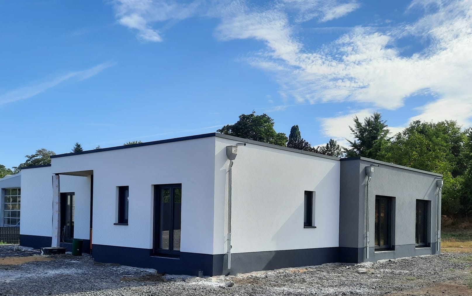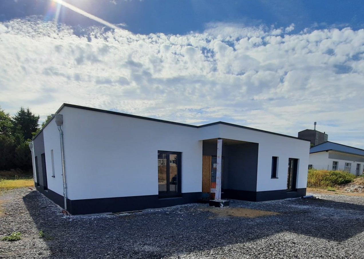Unser Leistungsumfang beinhaltet hier die komplette Gebäudehülle ab Oberkante Bodenplatte incl. Dacheindeckung, Fenster- und Raffstoreanlage, Außenputz sowie Lieferung des Trockenbaumaterial.