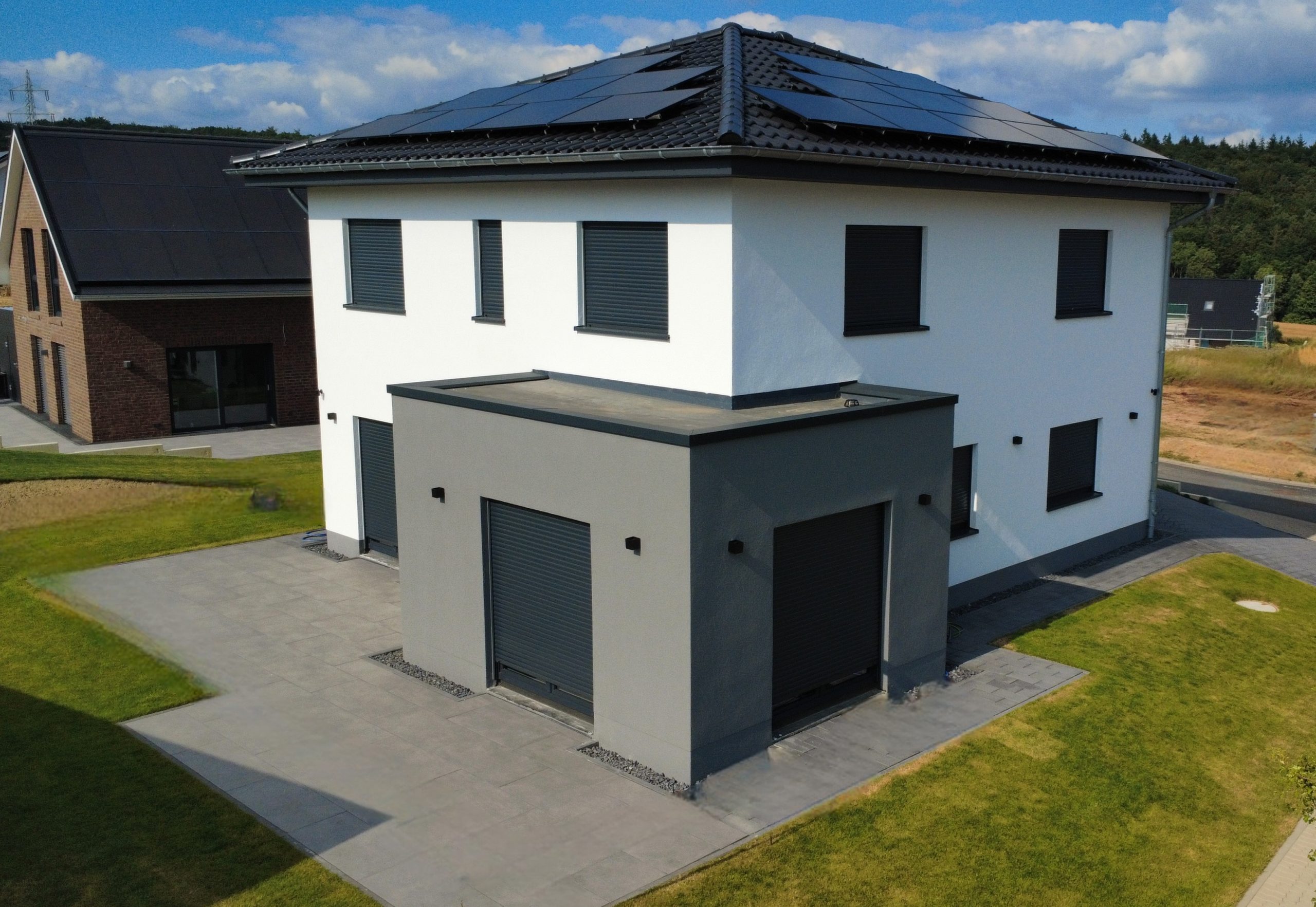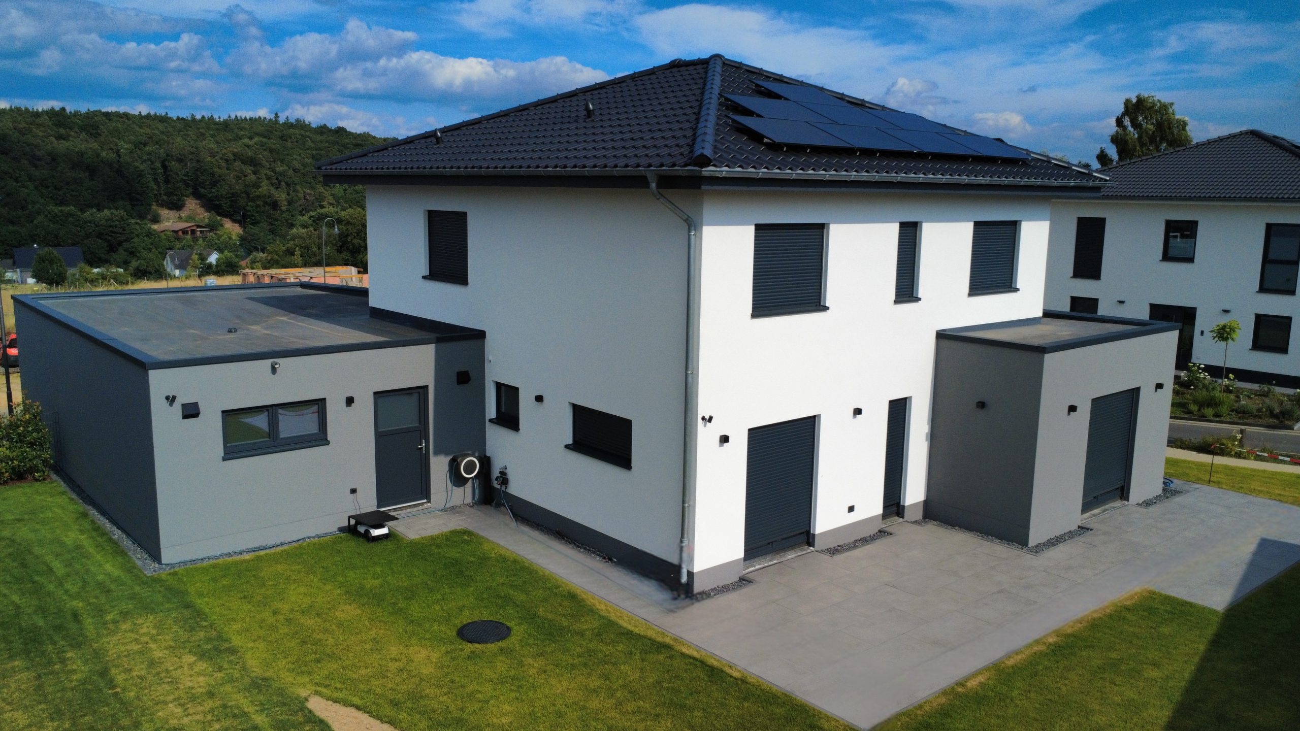 Unser Leistungsumfang beinhaltet hier die komplette Gebäudehülle ab Oberkante Bodenplatte incl. Flachdachabdichtung, Fenster- und Rollladenanlage, Außenputz, die Lieferung des Trockenbaumaterial sowie Erstellung der Trockenbaudecken.