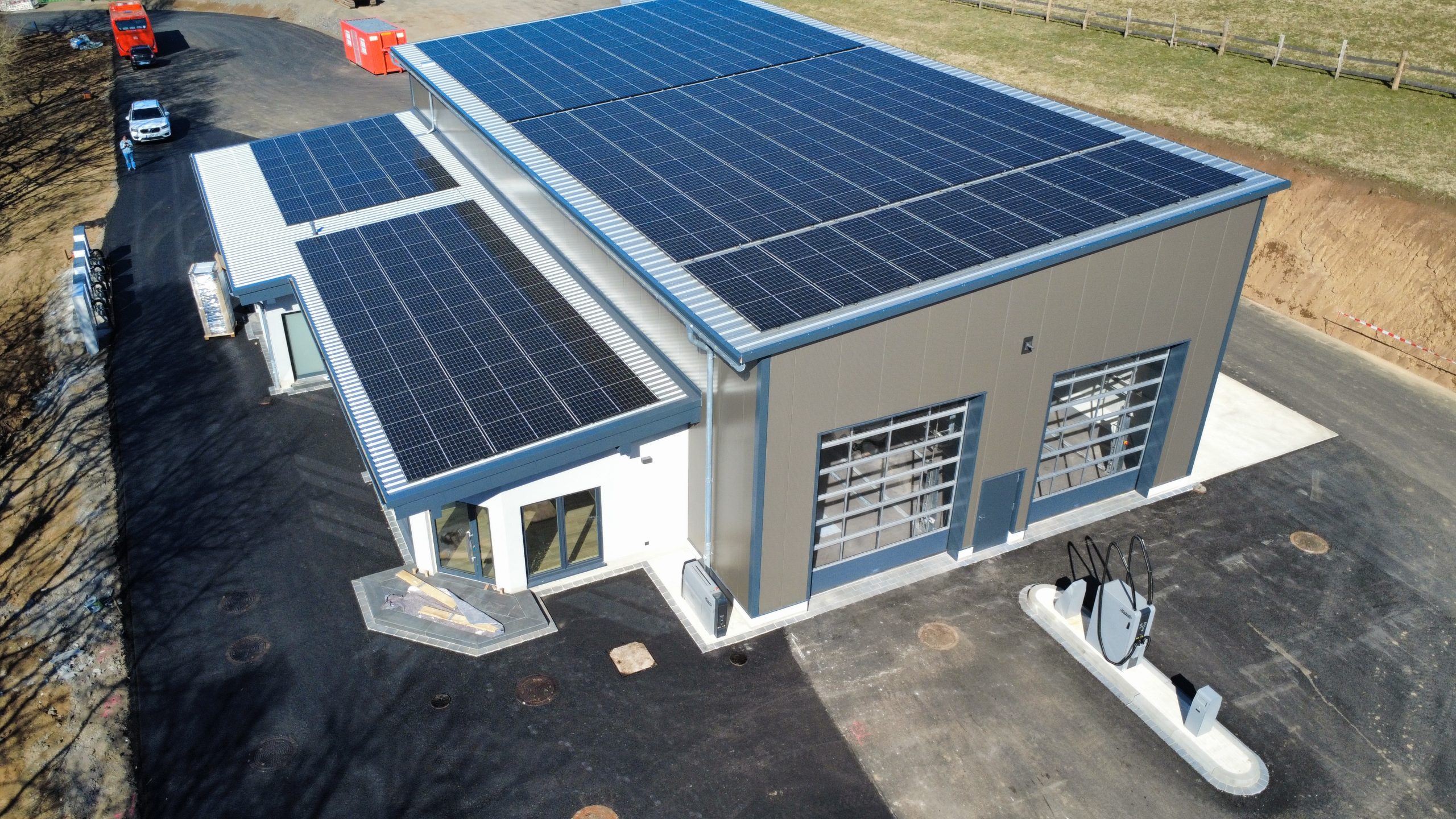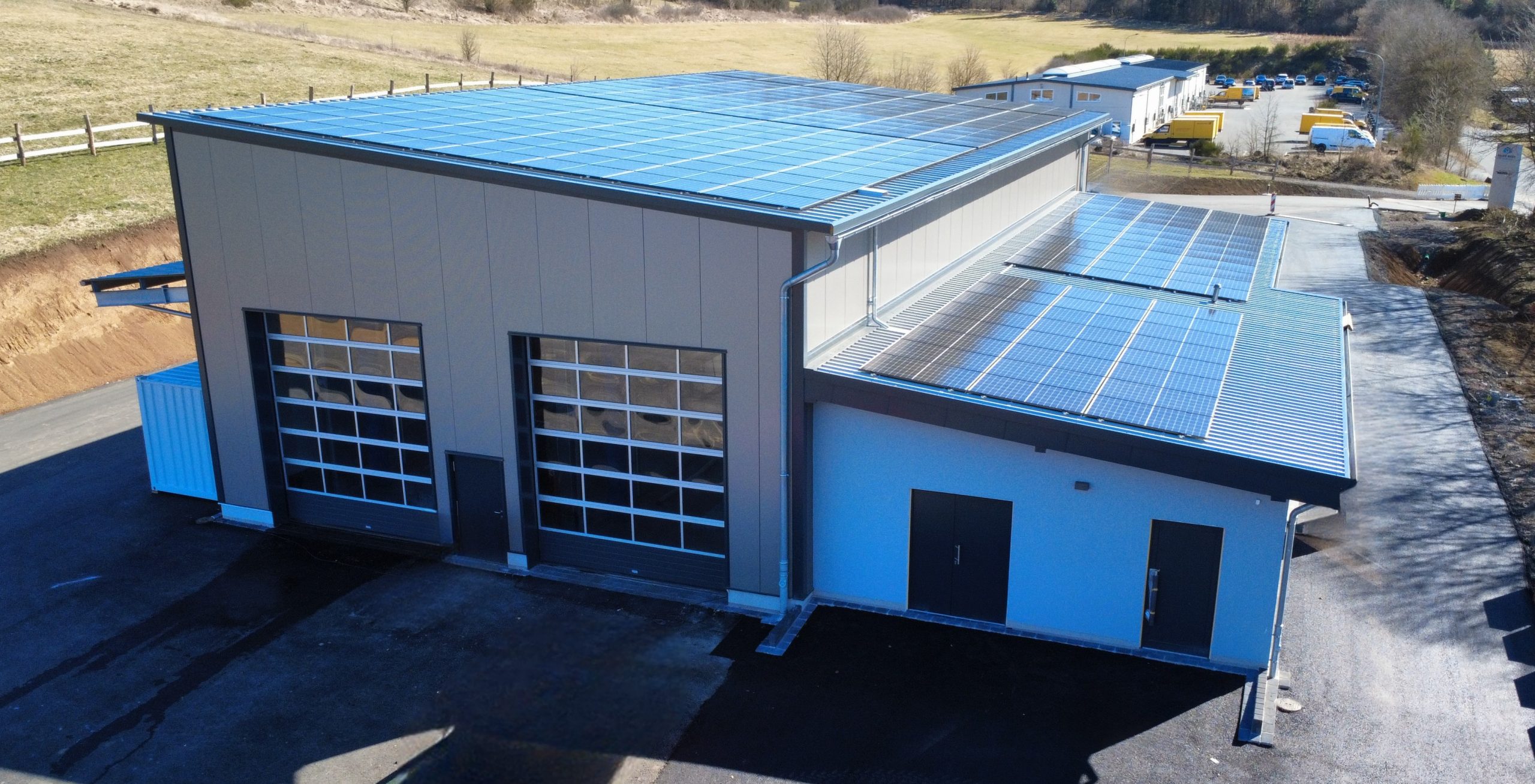 Die flachgeneigte Pultdachkonstruktion, sowie sämtliche Wandelemente, wurden im Werk Kelberg vorelementiert.