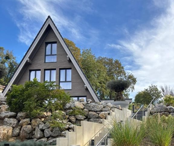 Der giebelseitig weit ausladenden Dachüberstand schützt auf Dauer die Fassade. Die großen Fensterflächen in allen Geschossen lassen einen atemberaubenden Blick über Steeden zu. Zudem wurde auch das Flachdach über dem Hauseingang komlett im Werk vorelementiert.