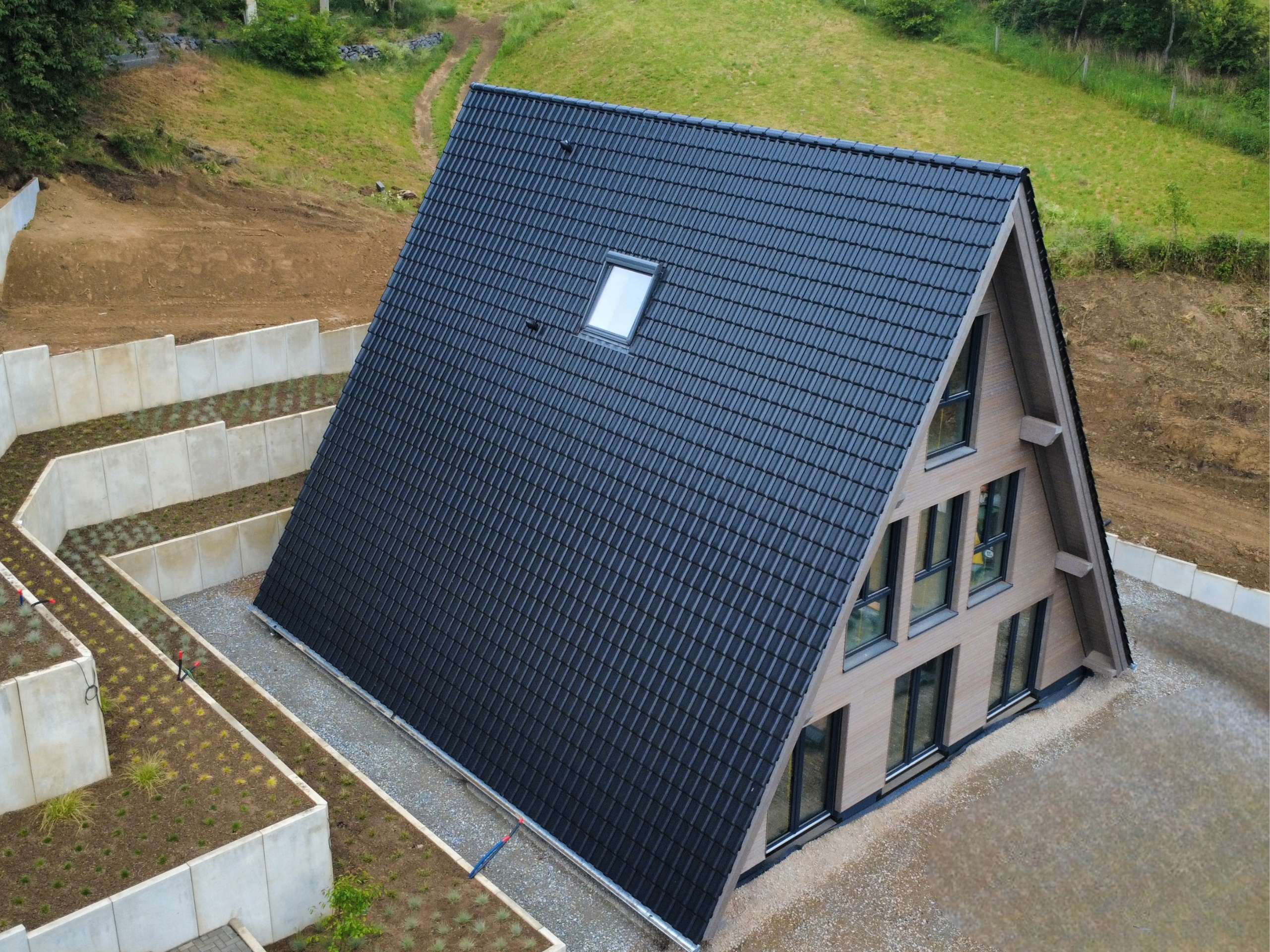 Die Dacheindeckung erfolgt mit einem Tonziegel der Fa. Creaton, Model Futura, in matt schwarz.