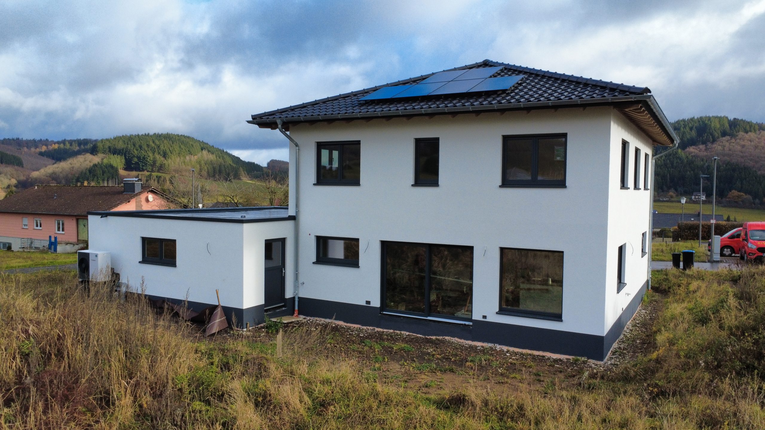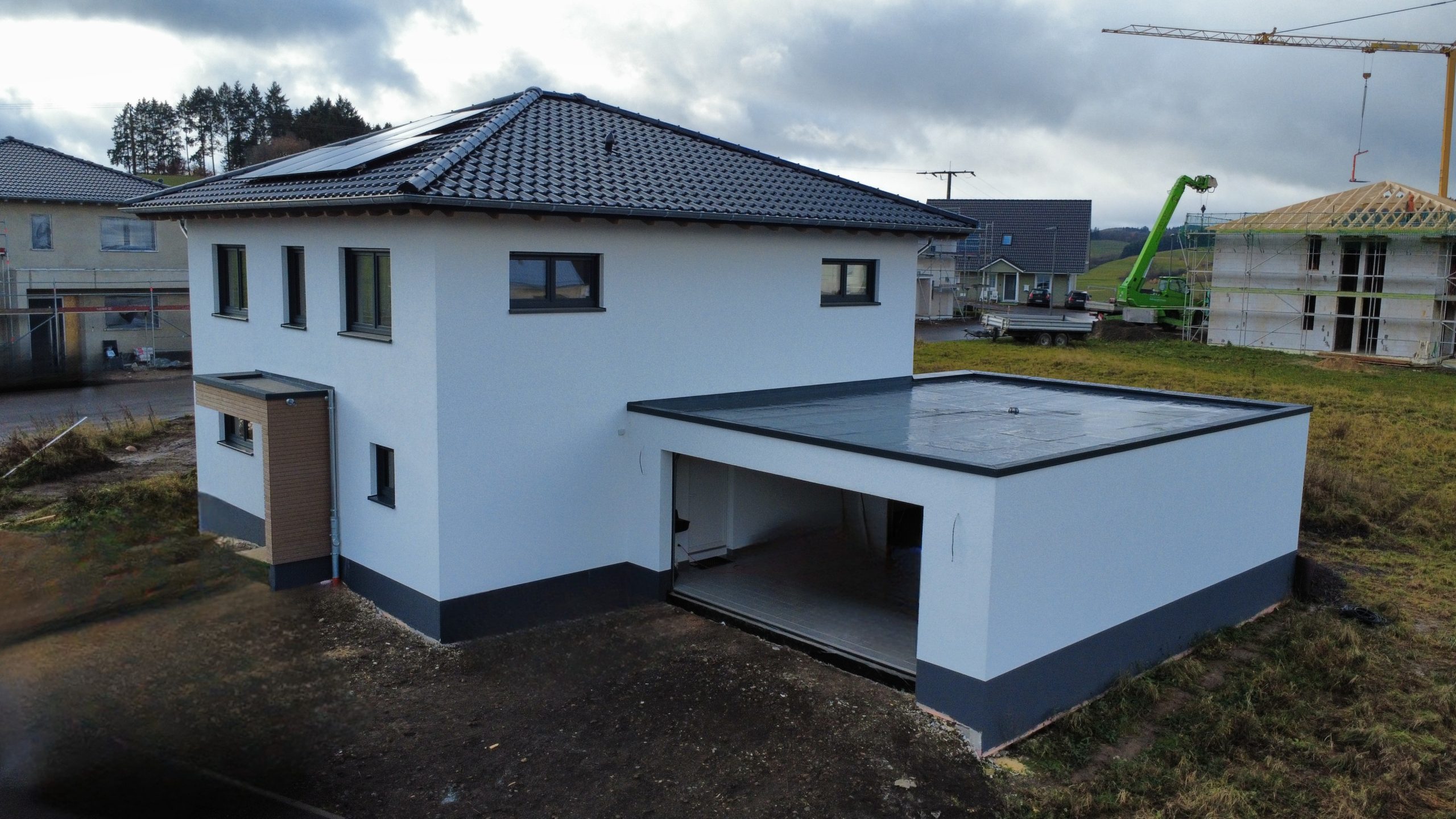 Unser Leistungsumfang beinhaltet hier die komplette Gebäudehülle ab Oberkante Bodenplatte incl. Steil- und Flachdacharbeiten, Fenster- und Rollladenanlage, Außenputz, sowie der Trockenbauleistungen.