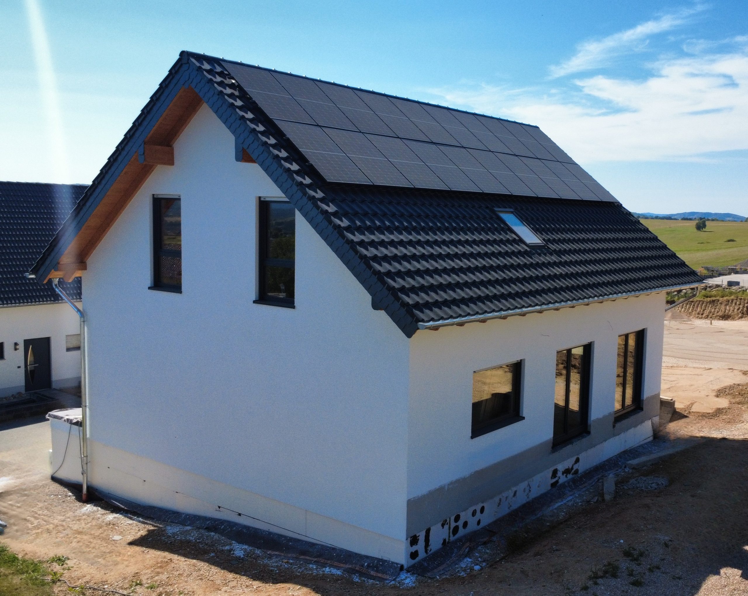 Die Fassade wird als Putzfassade erstellt, und die Kunststoff-Fensteranlage liefern wir im Farbton anthrazit. Dacheindeckung erfolgt mit einem hochwertigen Tonziegel unseres langjährigen Partners Creaton.