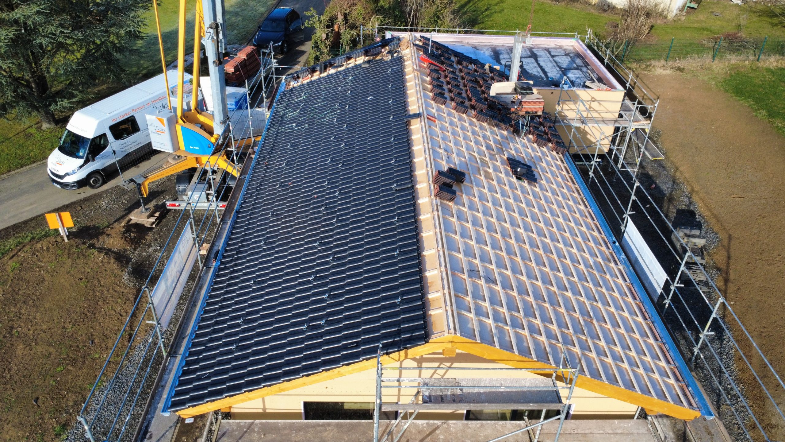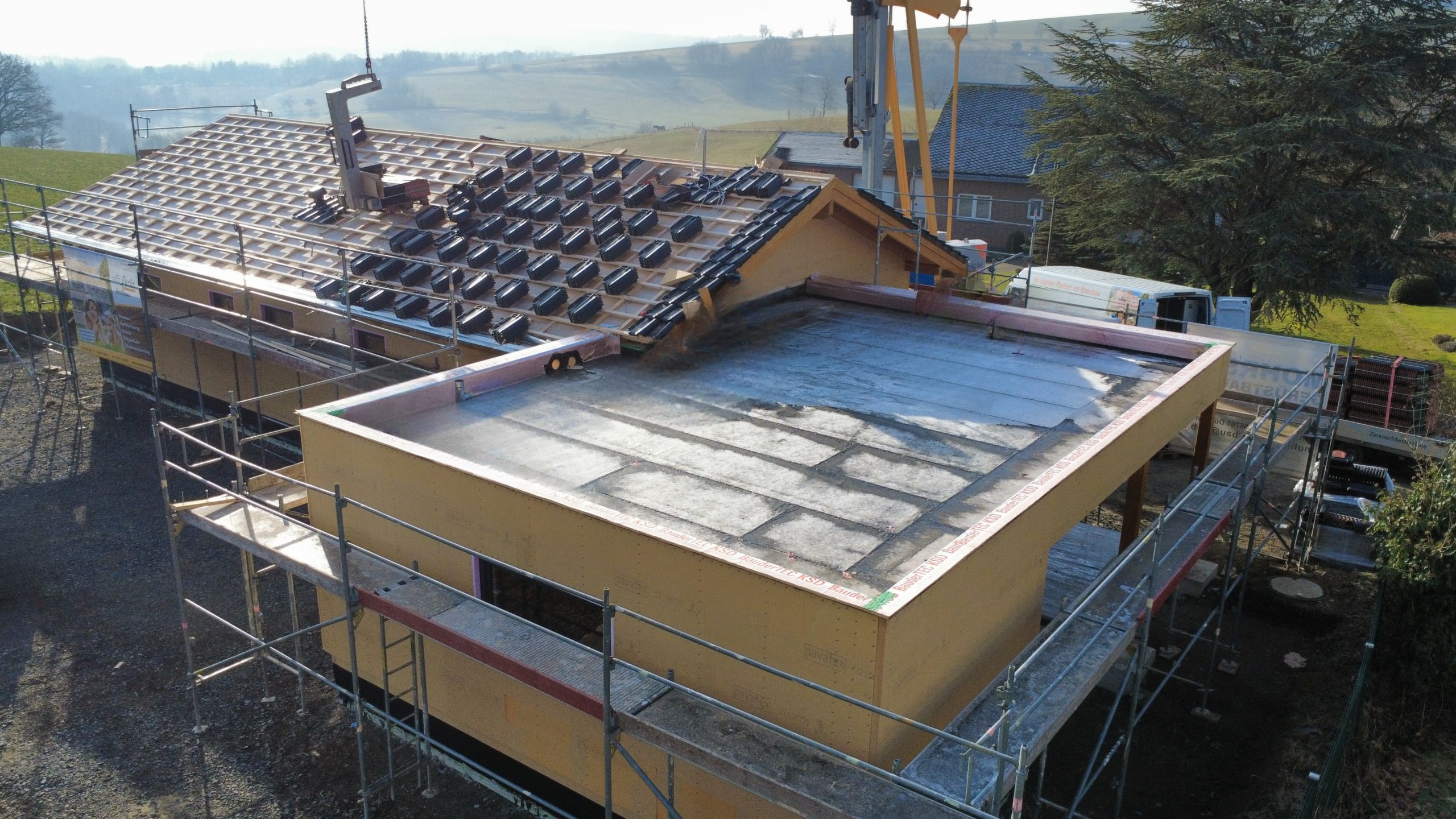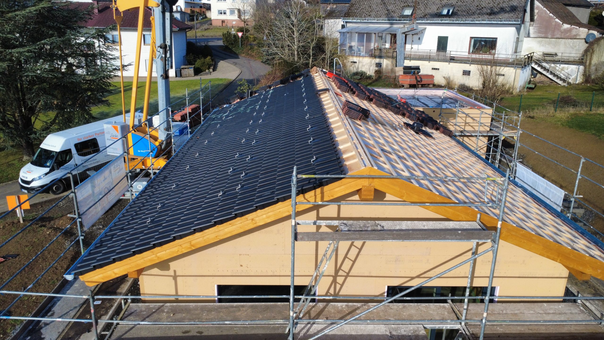 Ab Dienstag, 13.01.2026 errichtet Holzbau Fuchs ein Wohnhaus in Holzrahmenbauweise ab OK Bodenplatte in 56767 Sassen, Talweg 2.