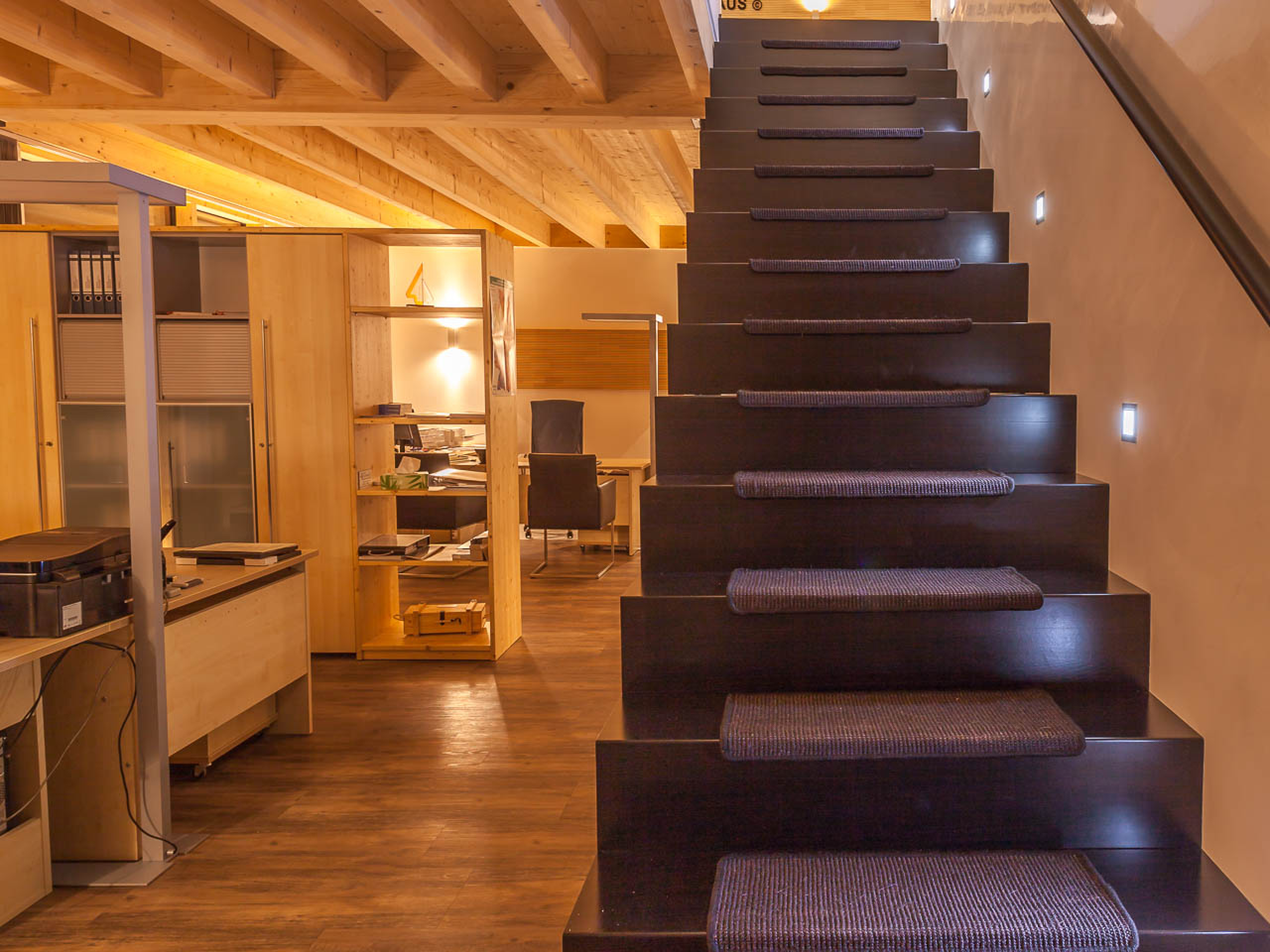 In seiner klassisch-modernen Haltung überzeugt es nicht nur im äußeren Erscheinungsbild, sondern auch im Grundriss mit einer reduzierten und geschickten Anordnung der Räume. Es bietet dem Unternehmen auf 400 Quadratmetern ausreichend Raum für die Arbeitsplätze der Mitarbeiter. Dazu kommen Besprechungsräume, ein großzügiger Sozialbereich sowie eine Naturheilpraxis mit einem gesonderten Zugang im Erdgeschoss. Der Architekt nutzte innen wie außen gestaltprägende Holzmaterialien, die durch moderne Plattenwerkstoffe ergänzt werden.