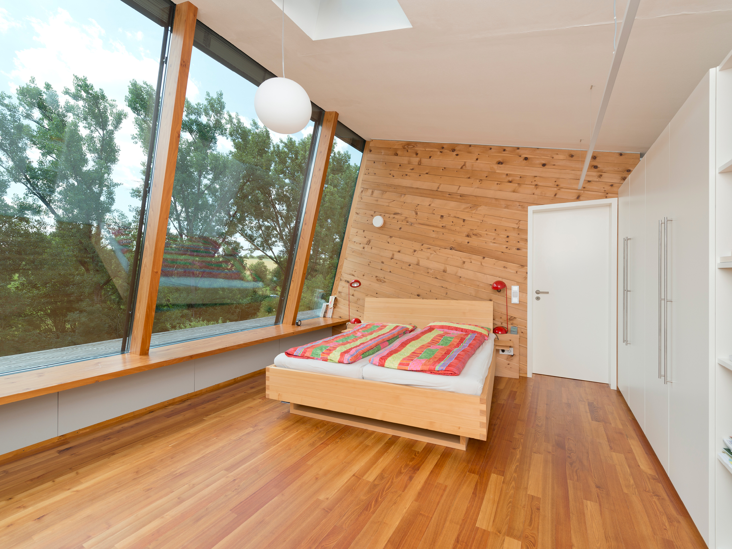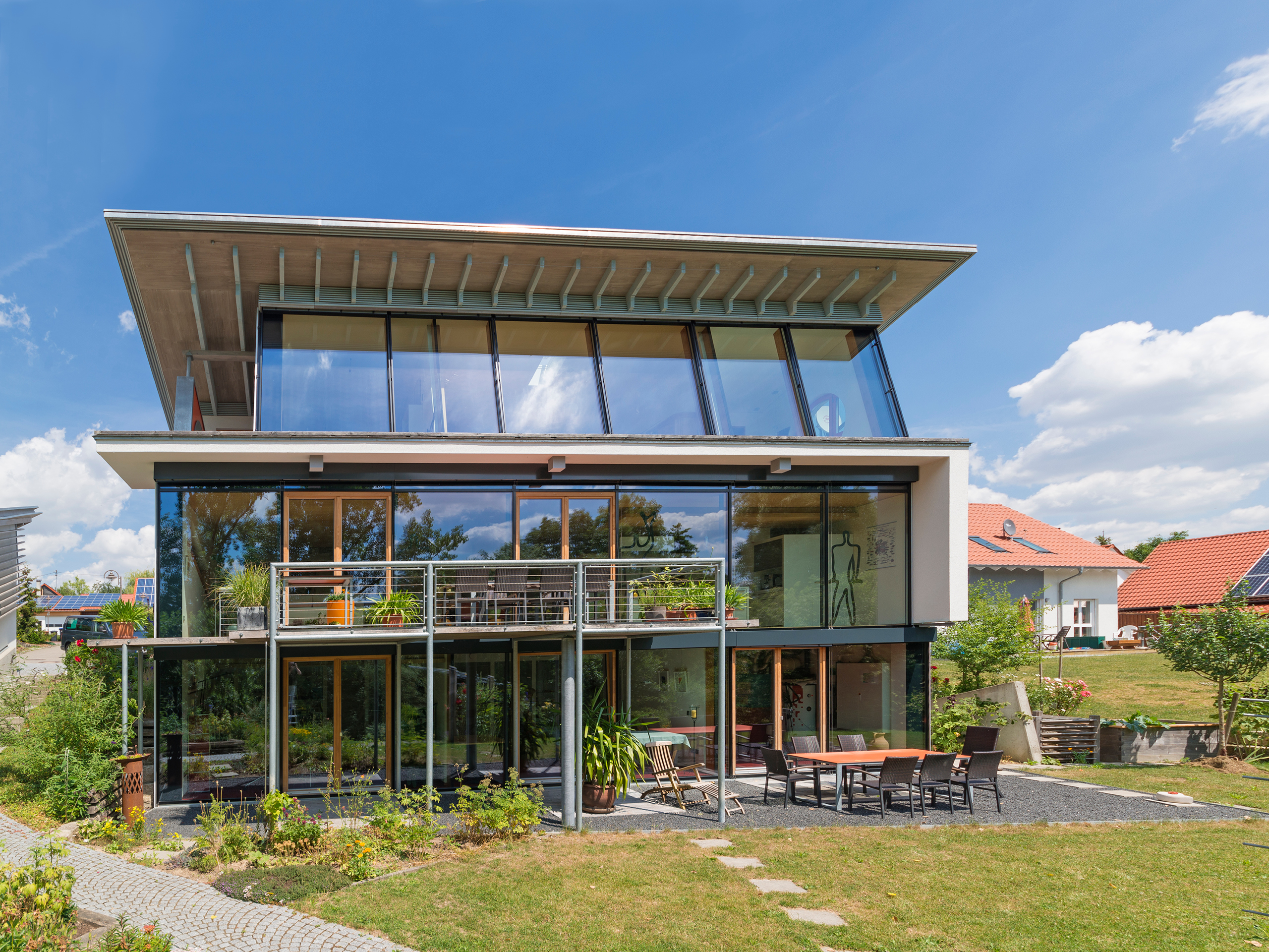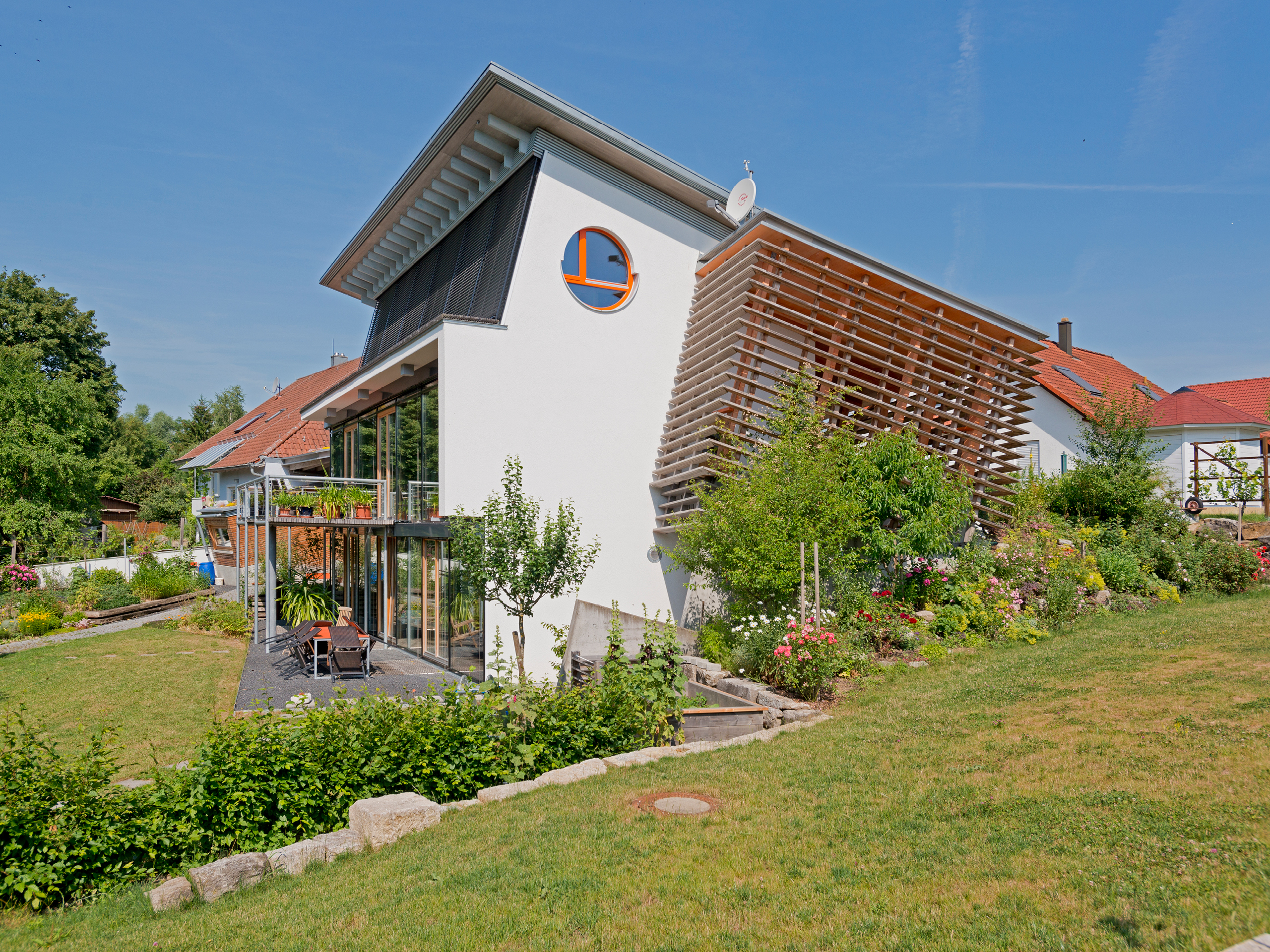 Die Sonne liefert in Haus Baumann den größten Teil der benötigten Energie. Denn es erfüllt mit U-Werten von 0,11 W/m²K die Vorgaben an ein Effizienzhaus 40 und ist mit einem Primärenergiebedarf von 36,30 kWh/m²a ein Passivhaus, zu dessen Beheizung keine fossilen Energieträger benötigt werden.