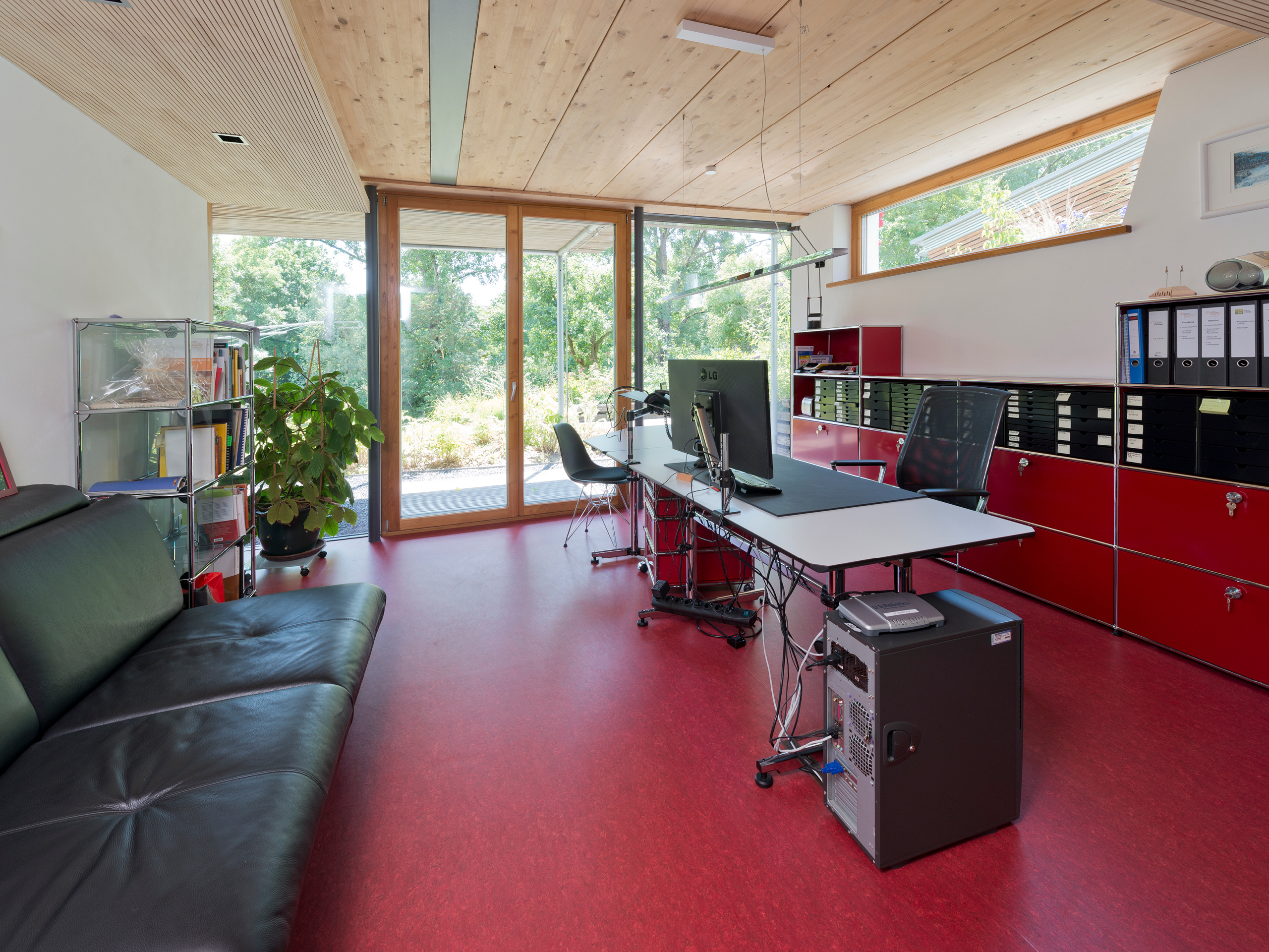 Letzteres gilt auch für die ökologischen Baustoffe: Holz, Holzwerkstoffe, eine Holzfaserdämmung und Gipskartonplatten stehen für gesundes und behagliches Wohnen.