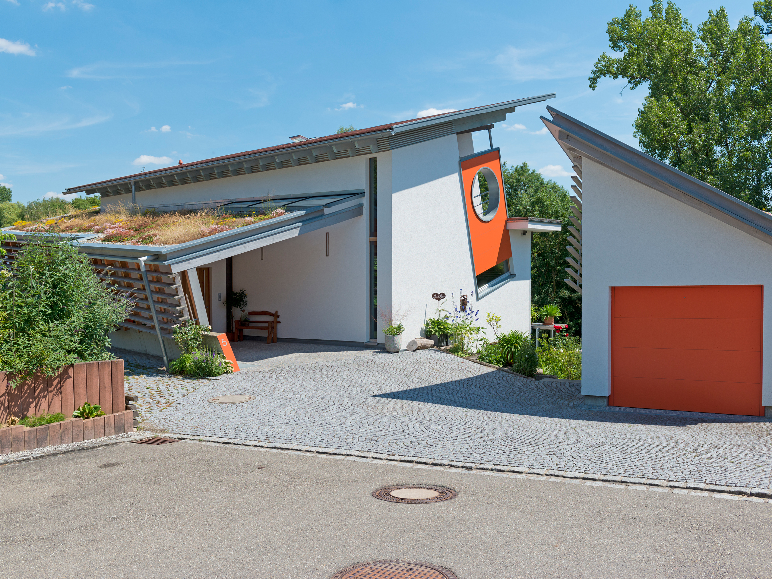 Wer sich Haus Baumann von Norden nähert, fühlt sich an eine moderne Skulptur erinnert: Mehrere Dächer nehmen spielerisch die Linien auf dem Hanggrundstück auf, kräftige Farbakzente und geometrische Figuren erinnern an die avantgardistische Kunst des 20. Jahrhunderts. Auf der Südseite dreigeschossig, bietet das Passivhaus mit großen Verglasungen einen unverstellten Blick in die Landschaft. Die solaren Gewinne liefern einen wichtigen Beitrag zur seiner Energieversorgung.
