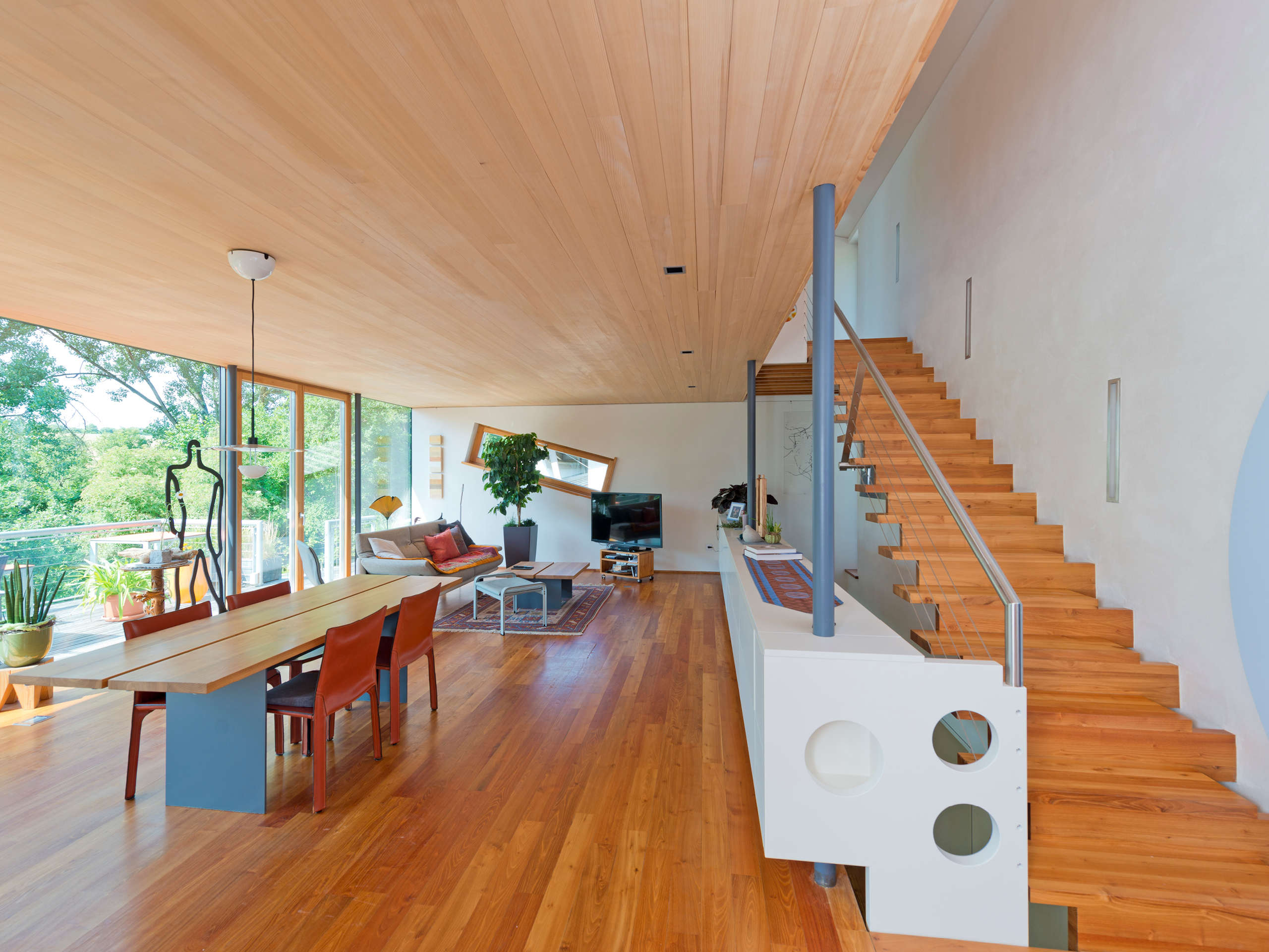 Innen kam die Naturnähe der Bewohner in der Wahl ökologischer Holzoberflächen aus Weißtanne, Robinie oder duftender Zirpenkiefer zum Ausdruck. Ein weiteres Charakteristikum ist die luftige Gestaltung der Innenräume, die schwerelos zwischen der Vollverglasung im Süden und der über drei Geschosse laufenden, offenen Treppe auf der Nordseite zu schweben scheinen. Im Zentrum der drei Ebenen steht das offene Wohnensemble, das mit rund 55 m² Wohnfläche fast das gesamte Erdgeschoss einnimmt.