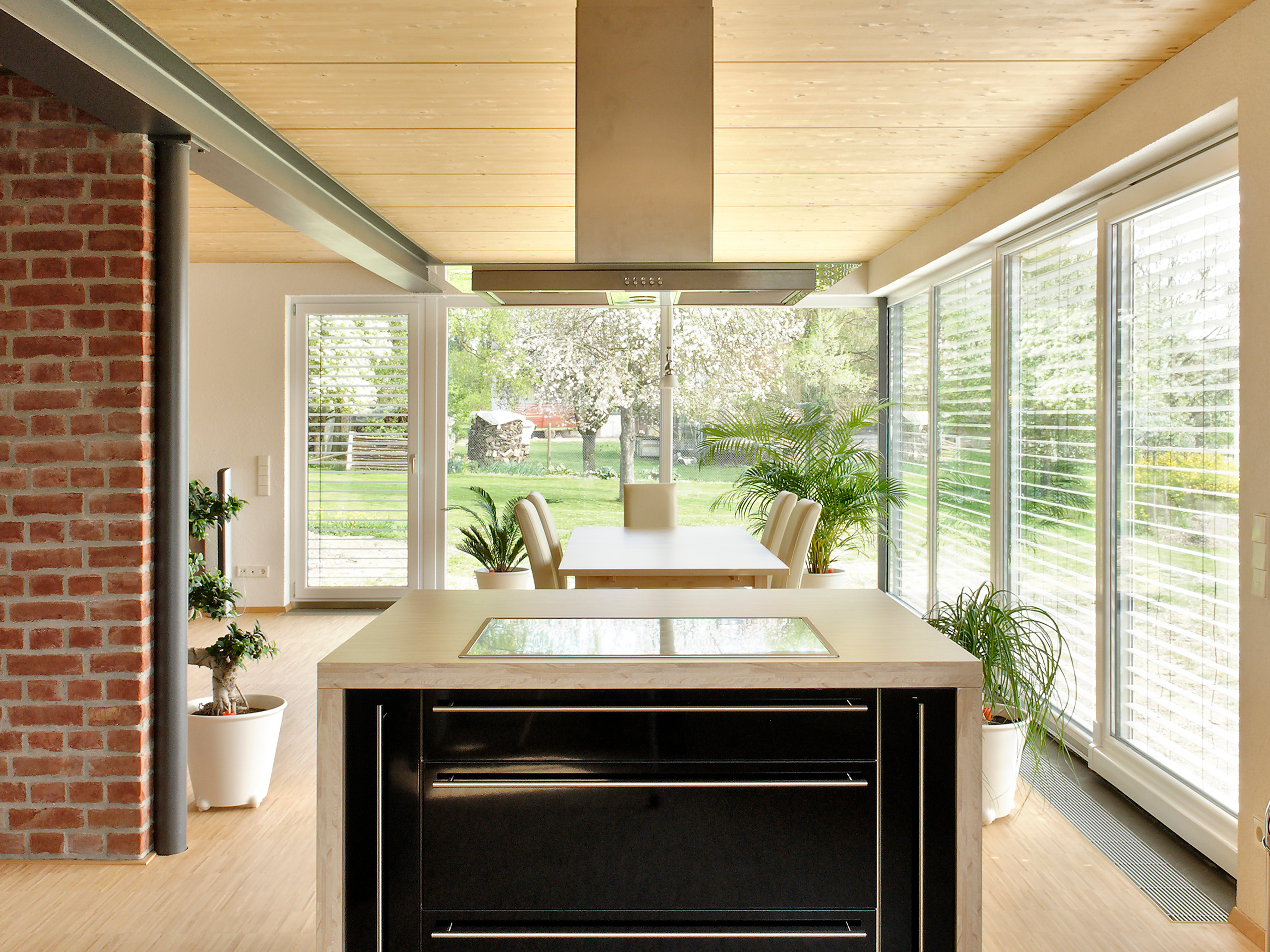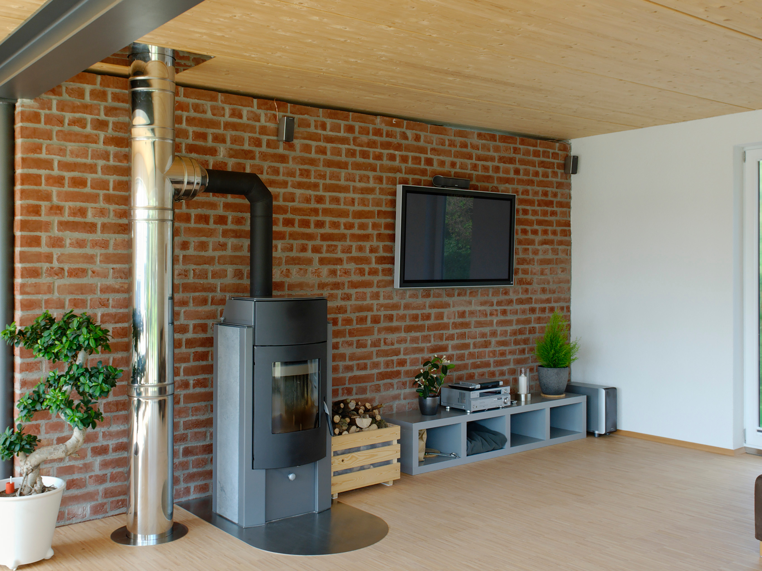 Mit konsequenter Südausrichtung, Solar-Wasserkollektoren und Wärmerückgewinnung aus der Lüftungsanlage mit Erdkollektor kann das Haus CO2-emissionsneutral beheizt werden. Wenn es draußen richtig kalt ist, sorgt der wassergeführte Kaminofen auf Stückholzbasis für angemessene Raumtemperaturen. Außenliegende Jalousien bieten im Sommer Schutz vor Überhitzung der Räume. Eine eigene Zisterne sammelt Wasser für die WC-Spülung und Gartenbewässerung.