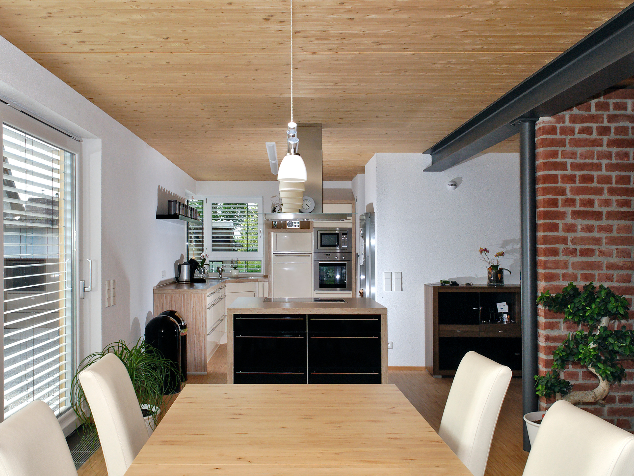 Der Wohn- und Essbereich beispielsweise wird durch das einfache Aufschieben der raumhohen Verglasung plötzlich zur Terrasse mit Gartenanschluss. Auch das geräumige Obergeschoss wird dank der großen Fenster vom Tageslicht verwöhnt. Kleinere Fenster über Eck kontrastieren dazu die gelungene Symmetrie der Fassade, die in Putz und Holzverschalung ihren speziellen Akzent setzt. Sichtbare Stahlträger und Klinkerverkleidungen innen wurden bewusst gewählt, um das robuste Gesamtbild des Hauses zu unterstreichen.