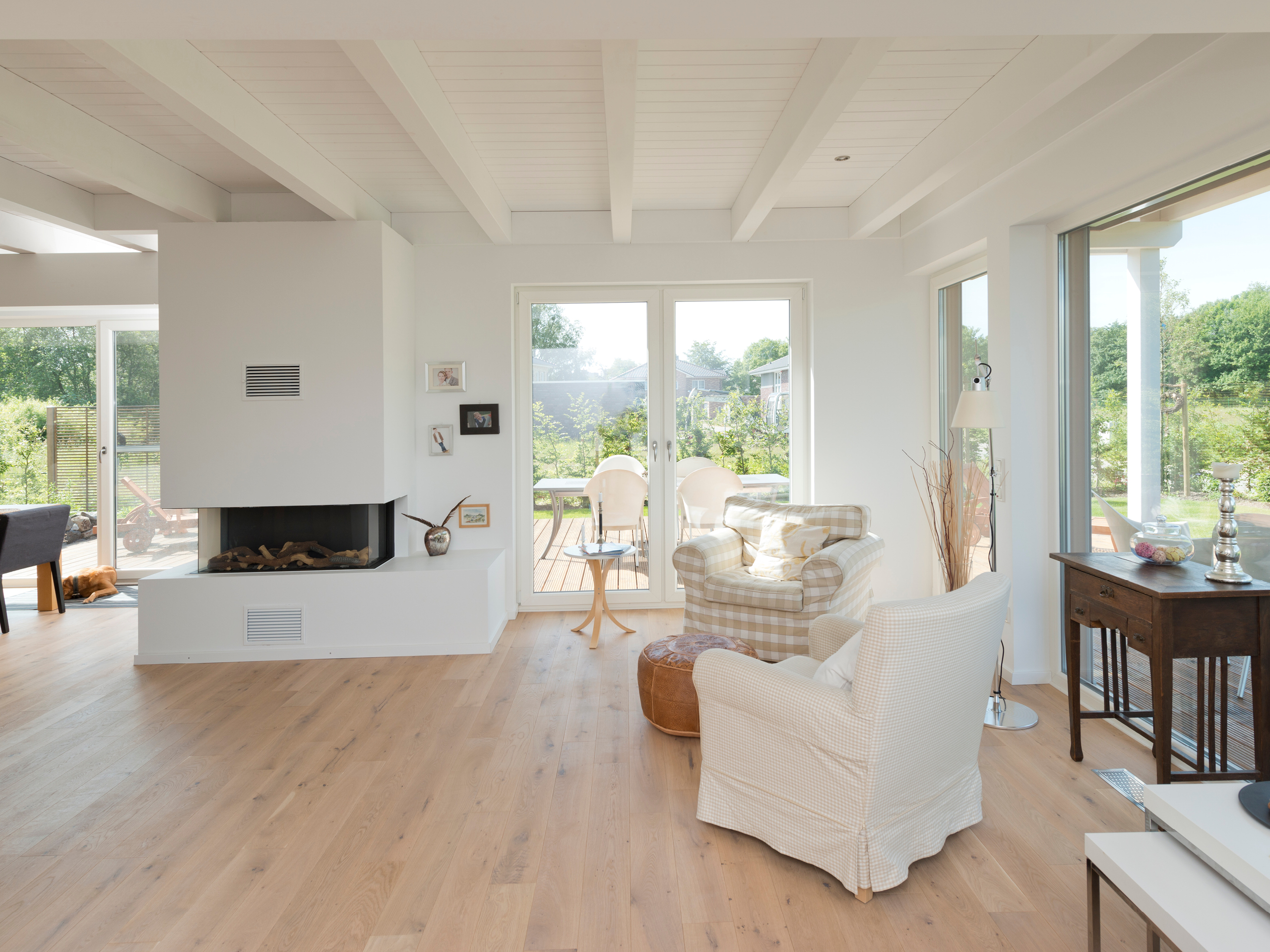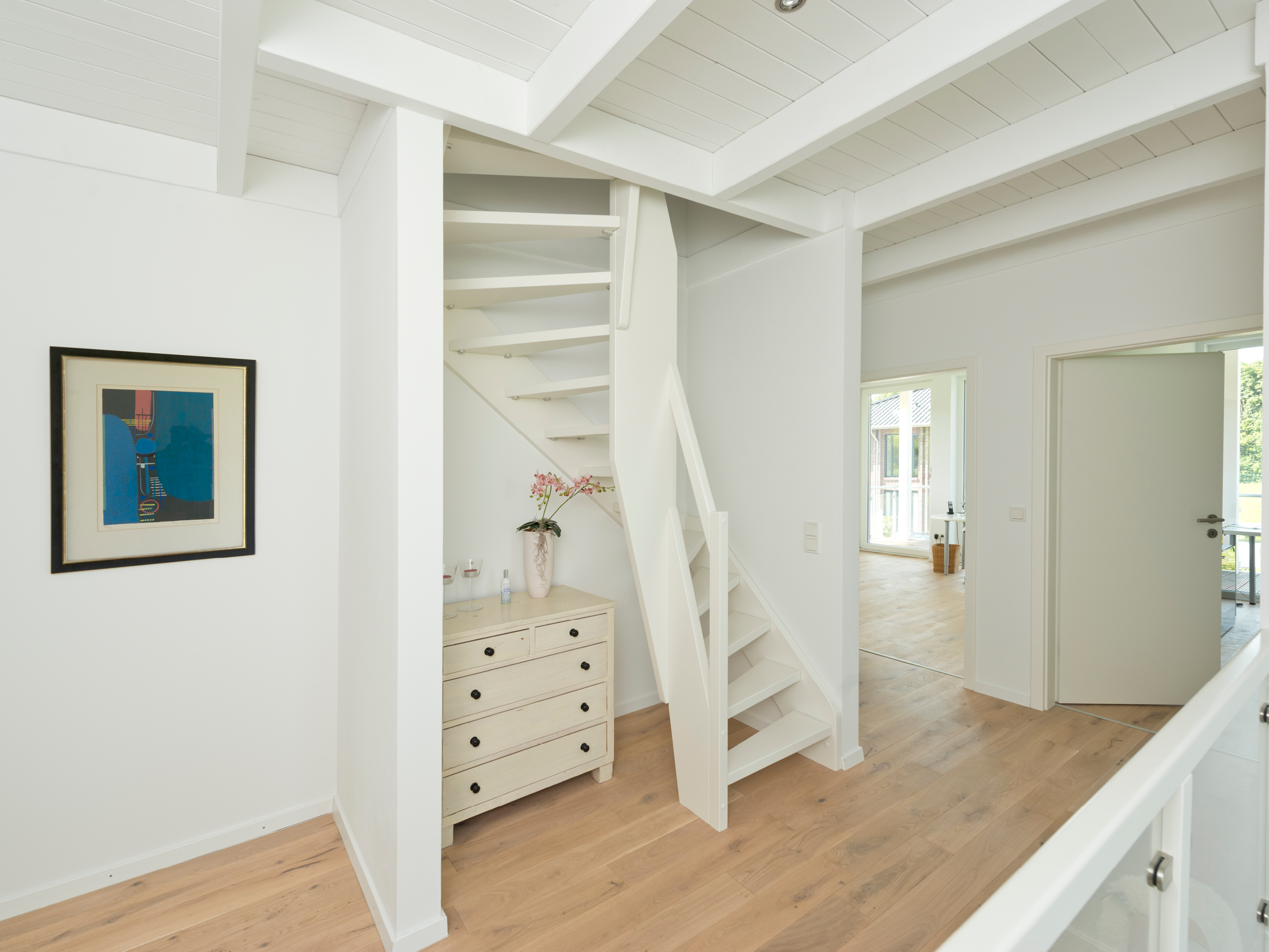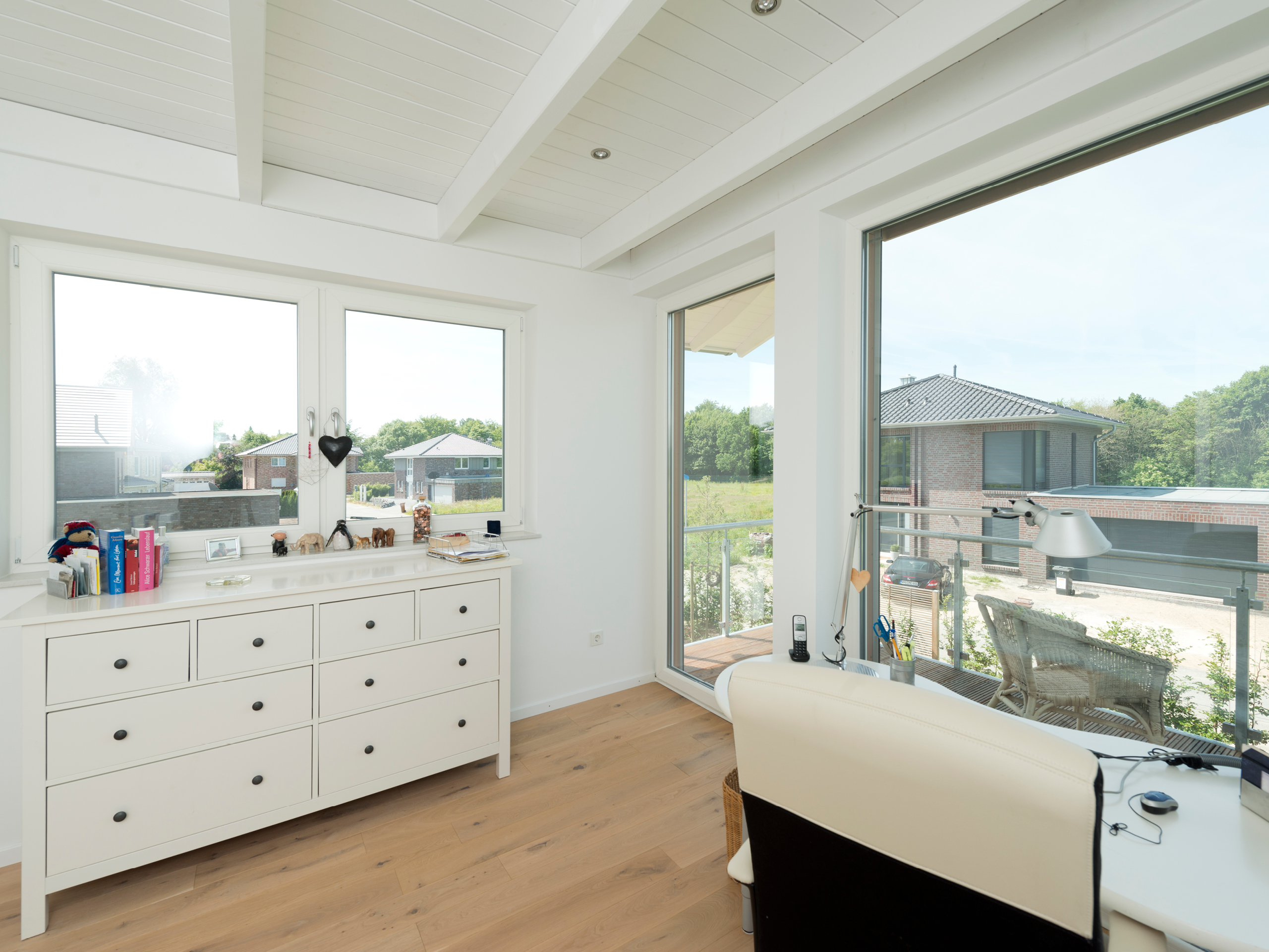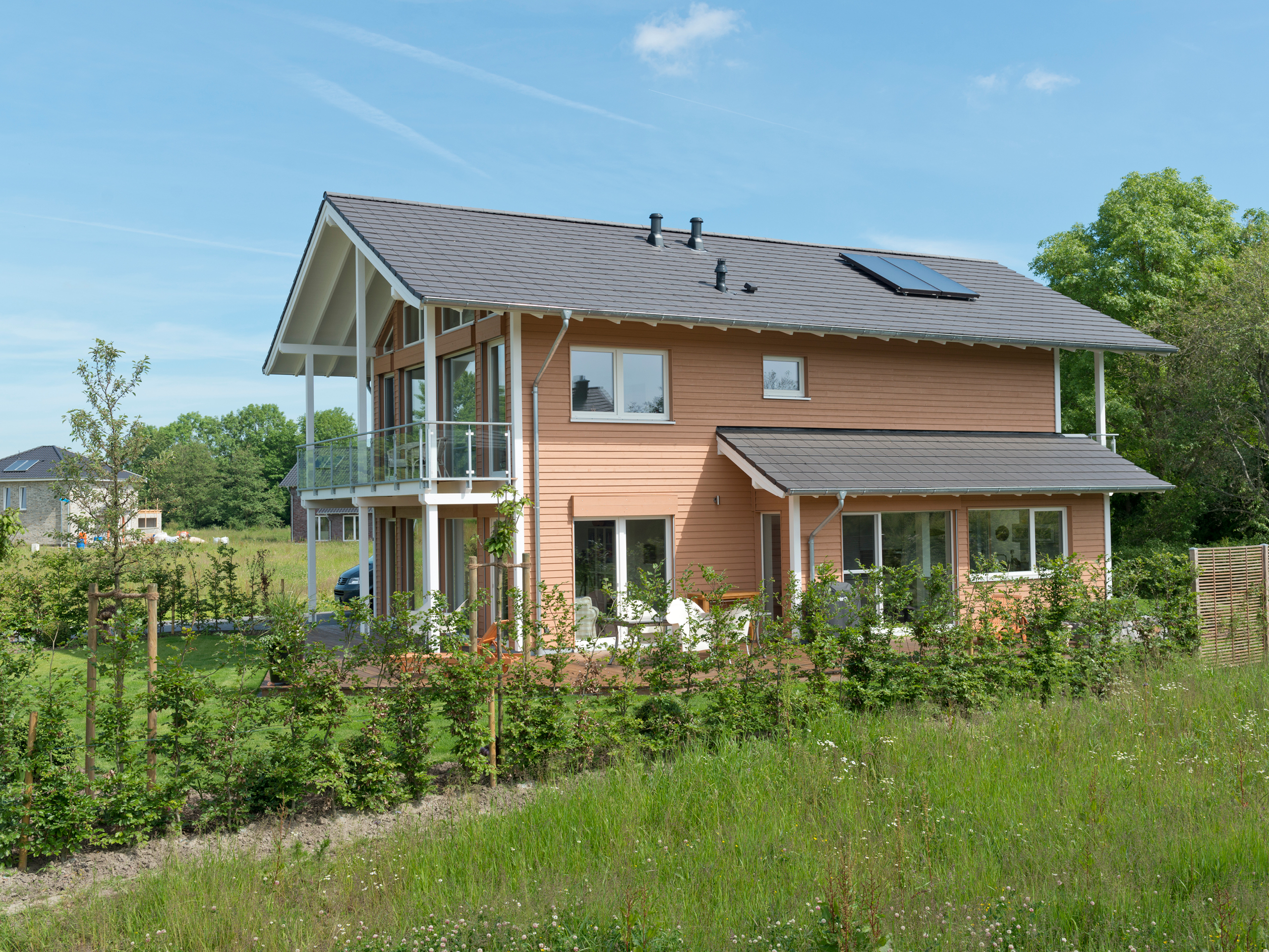 Berufsbedingt veränderte sich das Baufamilienpaar Kirsch von Süddeutschland in den hohen Norden – und brachte seine Vorstellungen vom eigenen Traumhaus mit. Als das Grundstück in einem schön eingewachsenen, stadtnahen Neubaugebiet gefunden war, machte sich Familie Kirsch auf Partnersuche für Planung und Bau. Wobei das Haus durchaus Anleihen am süddeutschen Baustil nehmen sollte. Der Weg zur regionalen ZimmerMeisterHaus-Manufaktur war nahezu folgerichtig, denn die Kirschs wünschten sich ein bis ins Detail individuell geplantes Holzhaus. Es entstand ein modernes Domizil mit offenen Räumen und einem hohen Energiestandard. Ohne Keller gebaut, hat es außerdem genügend Abstellfläche und Reserveräume, sodass man es flexibel für bis zu sechs Personen nutzen kann. Bereits nach vier Monaten war Einzug.