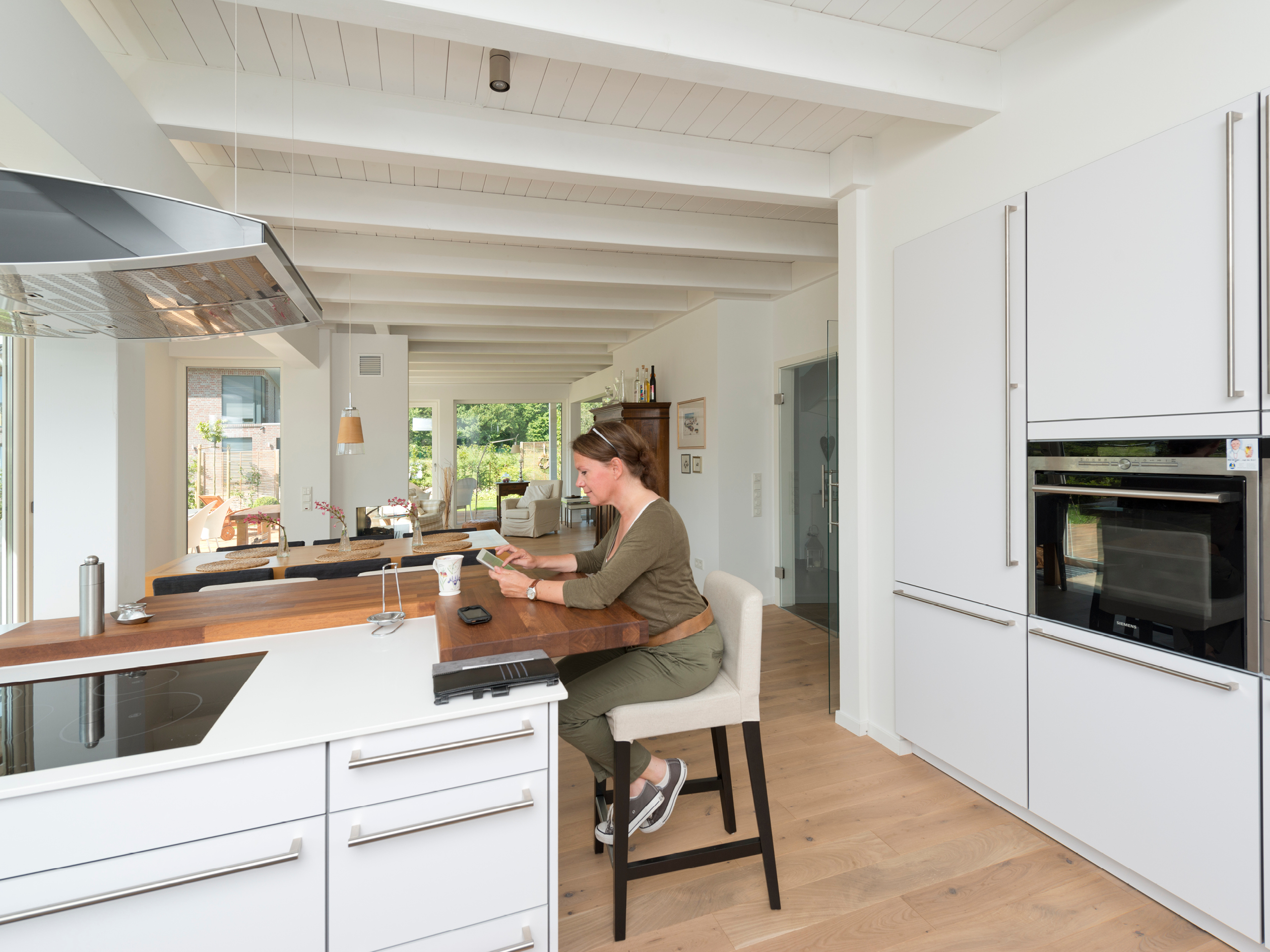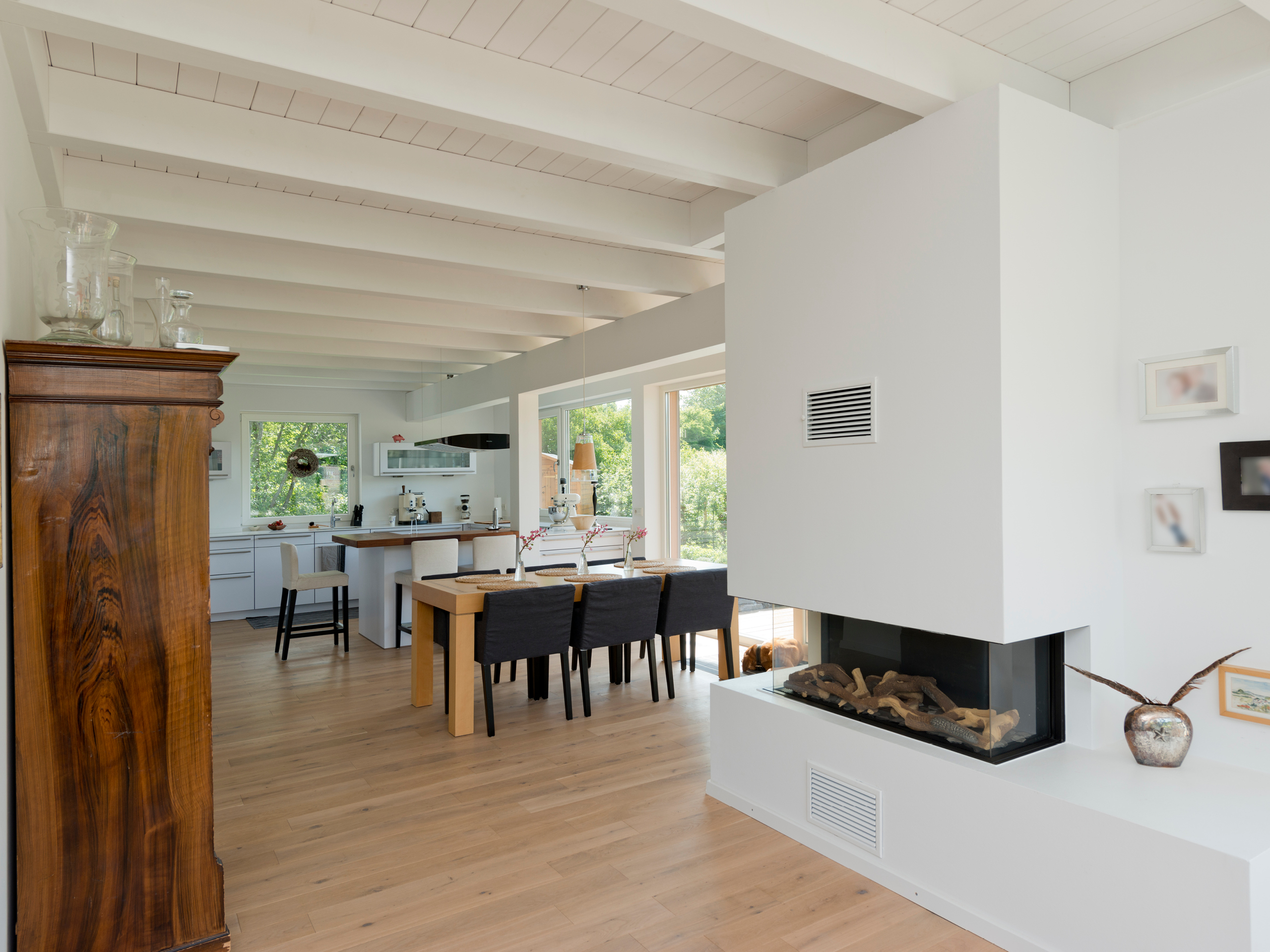 Wärme und Warmwasser liefern die Gasbrennwerttherme, eine Lüftungsanlage mit Wärmerückgewinnung und eine Solaranlage für das Brauchwasser. Ein Gaskamin schafft im Winter zudem Behaglichkeit. Um die gewünschte Helligkeit und Luftigkeit der Gebäudeatmosphäre zu erzielen, wurden großflächige Fenster eingeplant. „Und dass wir uns für eine Balkonbrüstung aus Glas entschieden haben, war das i-Tüpfelchen“, ergänzt Frau Kirsch. Bestens bewährt haben sich die großen Dachüberstände und die perfekt integrierten Außenrollos, die nur die Fassade vor Wind und Wetter schützen, sondern auch im Hochsommer für angenehme Temperaturen im Haus sorgen.