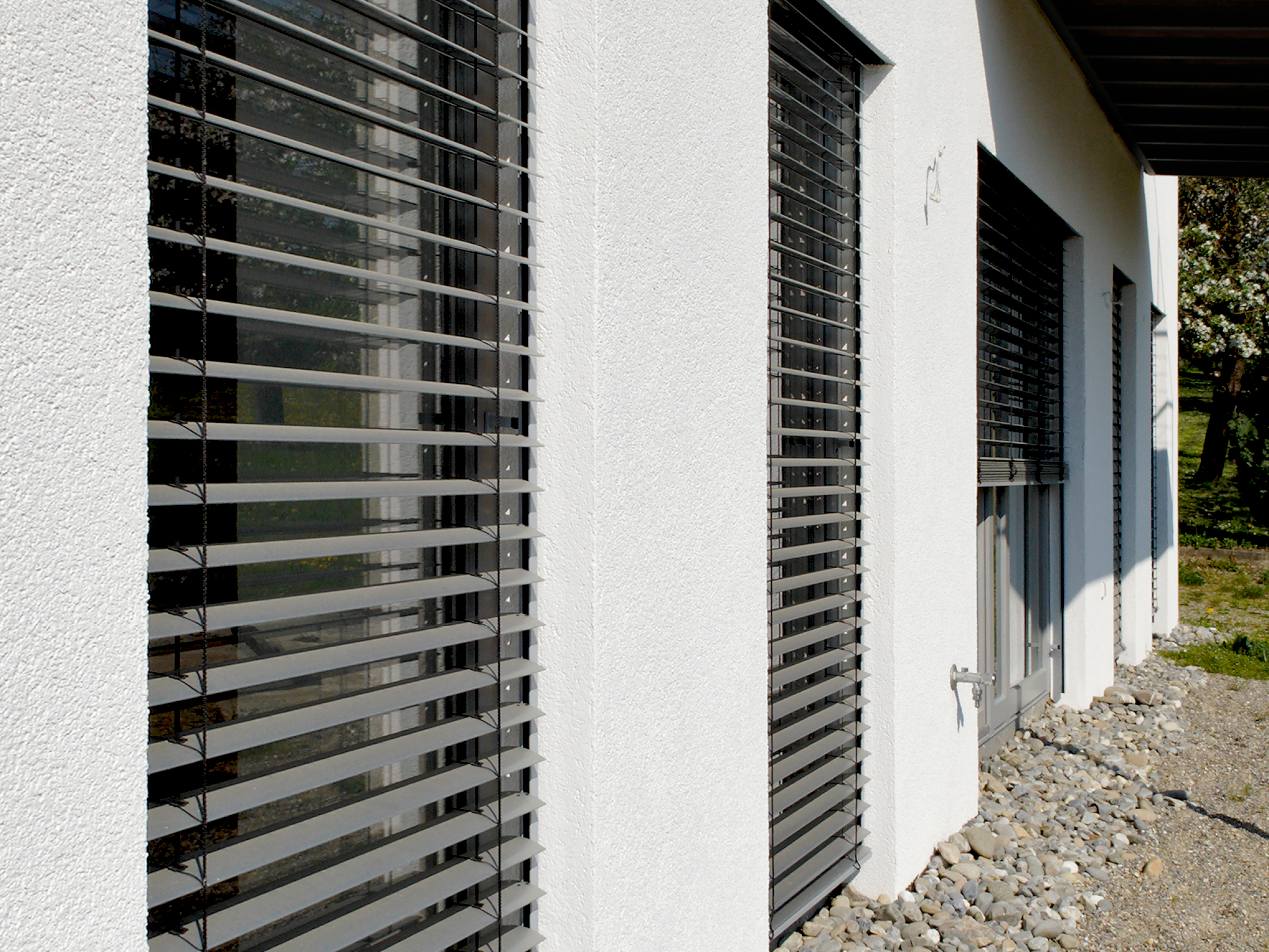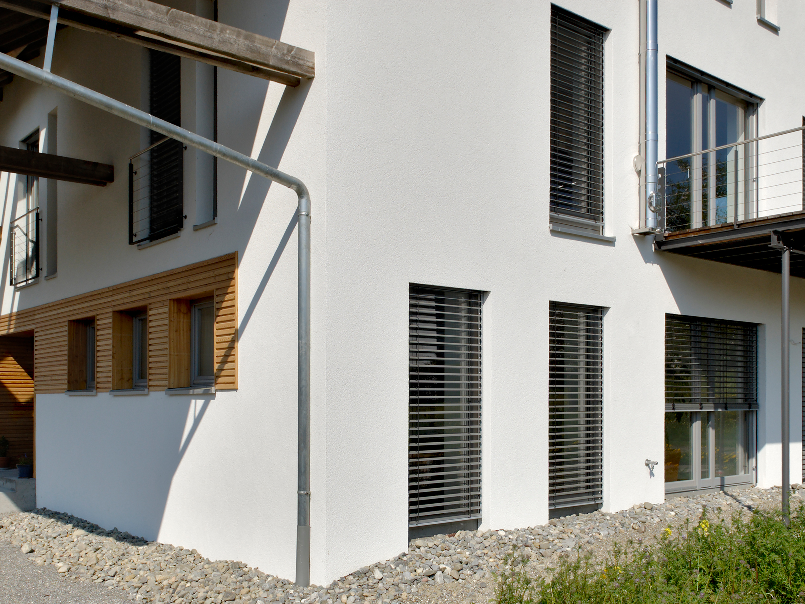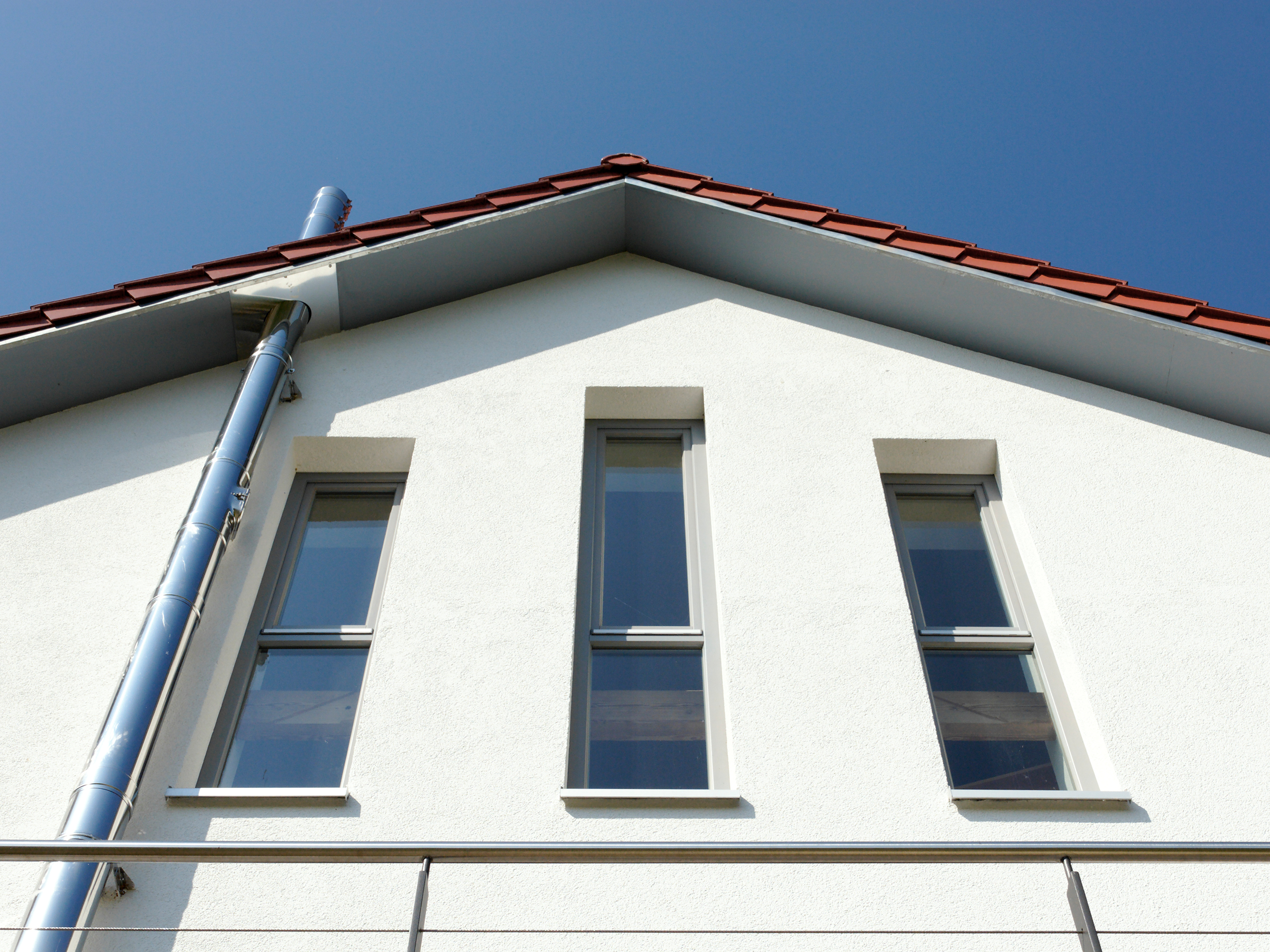 „Modernes mit bestehenden Formen zu verbinden, das war unsere Grundidee. Die Fensterformen und den markanten Dachvorsprung wollten wir erhalten. Letzterer dient schon immer als Sonnenschutz für die Südseite. Mit den eingelassenen Glasflächen ist der Bereich jetzt auch angenehm hell“, berichtet die Bauherrin. Da es keinen Keller gibt, wurden im Erdgeschoss die Werk- und Technikräume sowie der Bürobereich untergebracht, auf den oberen beiden Etagen wird großzügig gewohnt. Ihr Mann ergänzt: „Ein Detail gefällt uns besonders: Von der Rückseite des Büros kommen wir direkt in unseren Obstgarten – toll.“