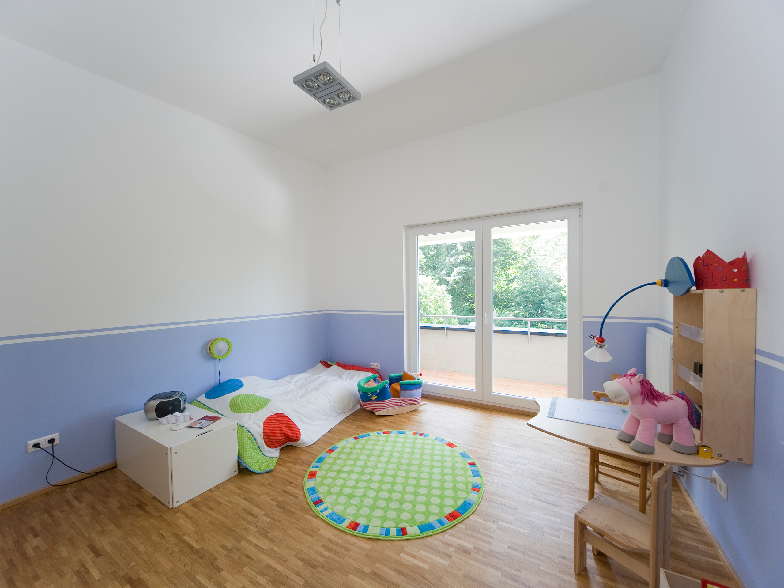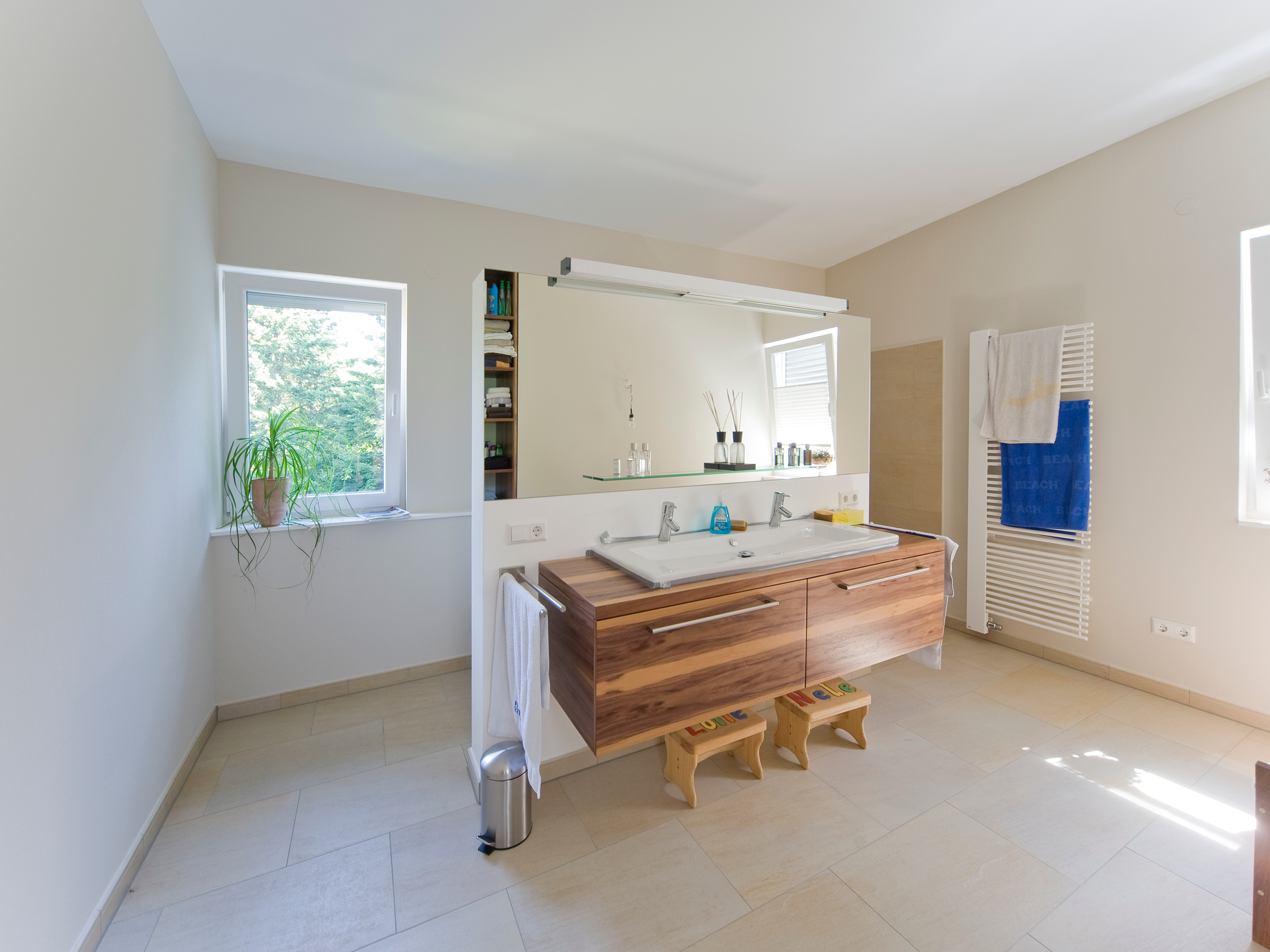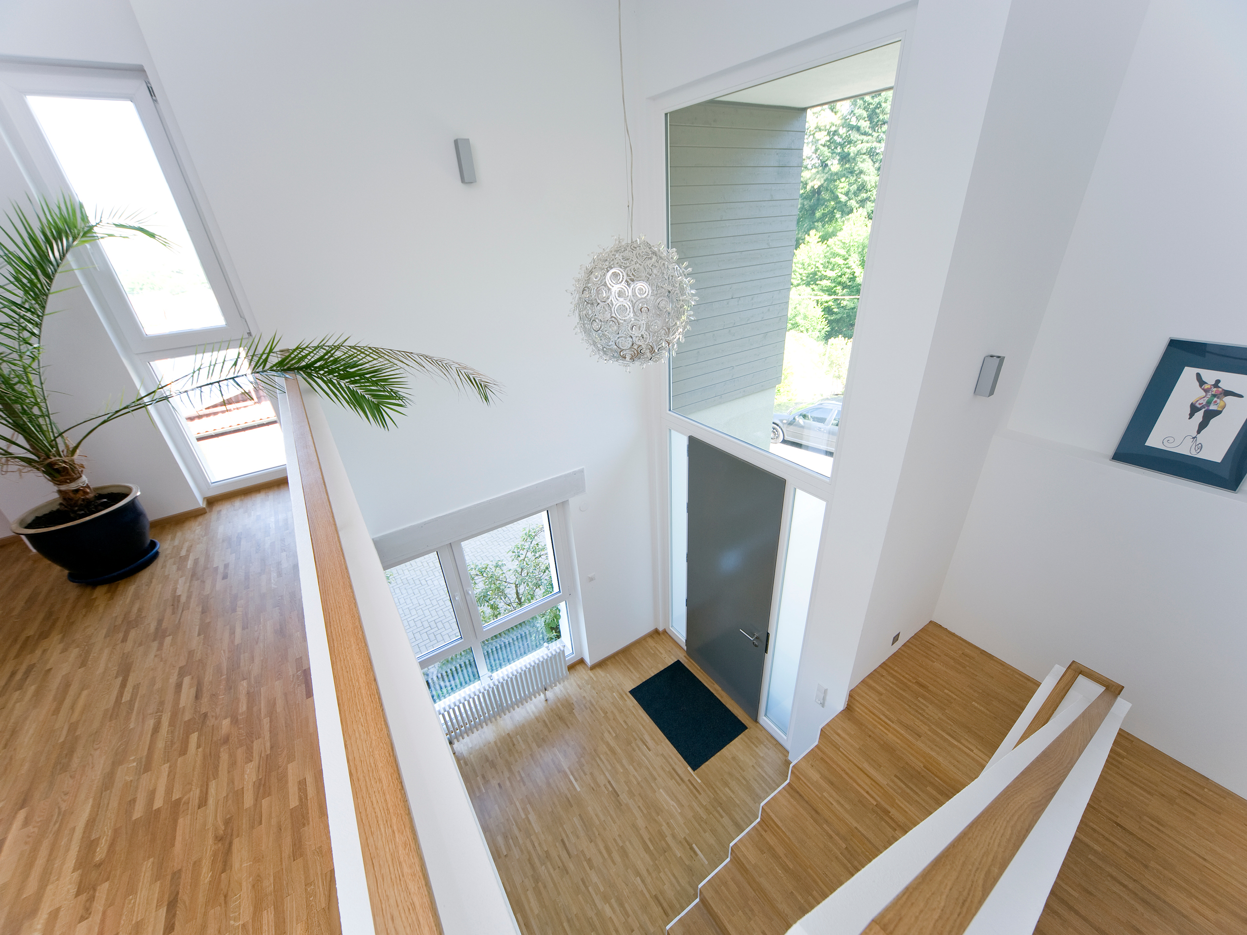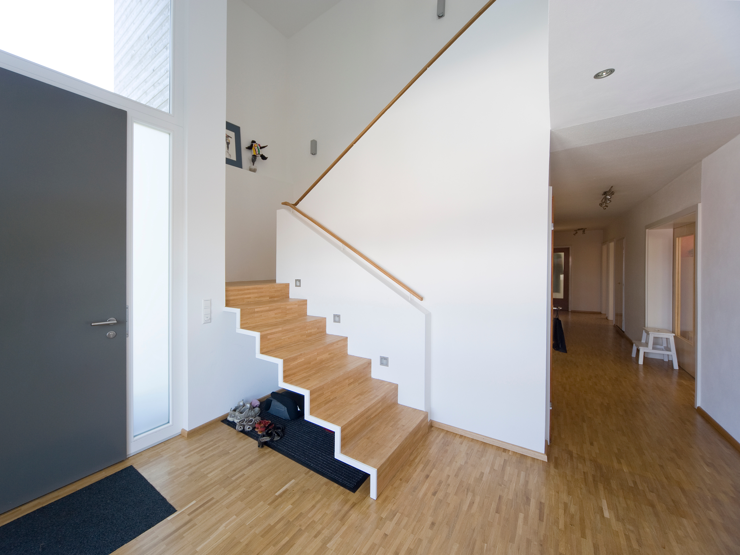 Die Familie entschied sich für die Aufstockungsvariante. Schließlich hat sie auf diese Weise sieben komfortable Räume dazu gewonnen, unter anderem ein Elternschlafzimmer mit Blick auf den nahen Wald, die dazugehörige Ankleide und ein modernes Wohnbad. Daneben befinden sich die beiden Kinderzimmer – knapp 16 m² groß, ohne einschränkende Dachschrägen, über Balkontüren gut belichtet und nahezu gleich zugeschnitten. Keine der beiden Töchter Jasmin (6) und Mara (8) wurde also bei der Verteilung der großzügigen Räume benachteiligt. Ein komfortables Ambiente für die Jüngsten, wie es nur mit der Aufstockungsvariante realisierbar war. Ein Abstellraum, der auch als Spielbereich dienen könnte, und eine von allen Familienmitgliedern genutzte Bibliothek vervollständigen das Raumprogramm. Erschlossen wird das Obergeschoss durch eine gegenläufige Podesttreppe in einer Diele mit atemberaubender Galerie. Um diese beeindruckende Eingangssituation zu schaffen, ließen die Architekten den Eingangsbereich des Bungalows teilweise abreißen.