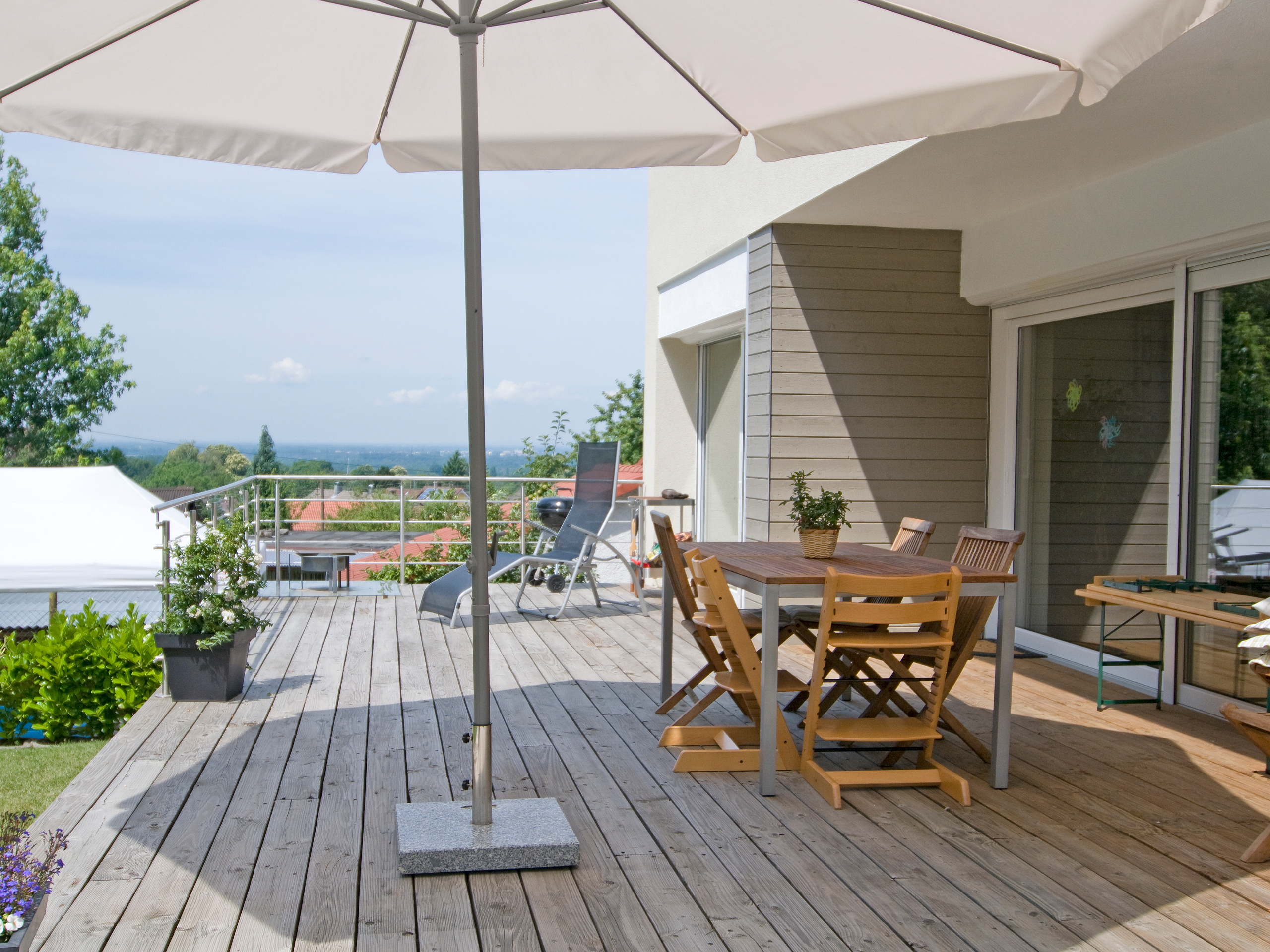 Äußerlich hat sich Haus Riedmüller dank Aufstockung und Fassadensanierung gravierend verändert. Aus dem 60er Jahre-Aschenputtel mit dunkelbrauner Holzschalung und Glasbausteinen ist ein moderner Entwurf mit flachem Pultdach geworden. Zu dieser Modernität gehört, dass die ZimmerMeisterHaus-Manufaktur das neue Obergeschoss durch eine dezent graue Holzschalung vom bestehenden Baukörper abgesetzt hat. Dabei bildet die Schalung nicht nur einen angenehmen Kontrast zur helleren Putzfassade, sie signalisiert zugleich den materiellen und konstruktiven Unterschied zwischen Alt und Neu. Nur die Terrassenseite wurde vollflächig verputzt. Hier dominiert das Erdgeschoss mit seiner transparenten Fassade die Hausansicht. Im Obergeschoss bildet eine breite Loggia-Freisitz und Sonnenschutz für die Kinderzimmer ein optisches Gegengewicht, das zur Gliederung der breiten Fassade beiträgt. Weitere Akzente setzen der farblich abgesetzte Dachsockel und das weit überstehende Pultdach.