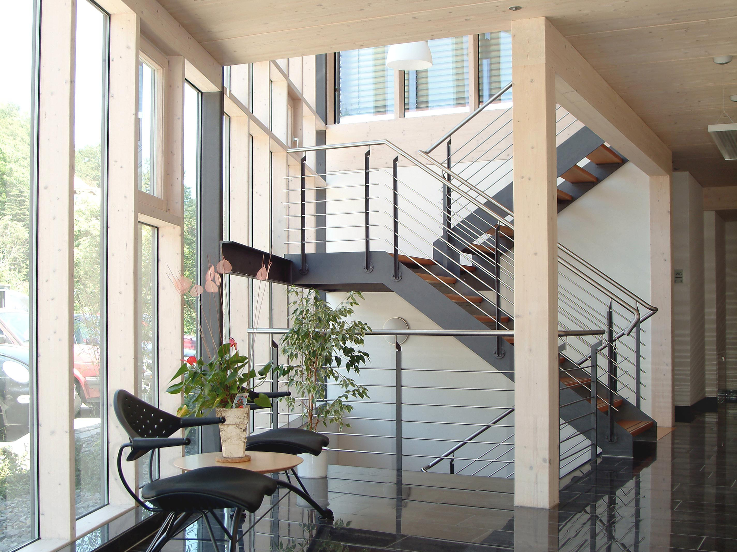 Das Solar-Büro-Wohnhaus verbindet Wohnen und Arbeiten auf besonders komfortable Weise, besteht es doch aus einem großzügig geschnittenen Wohntrakt und einem Firmentrakt mit zehn Büros und drei Besprechungsräumen. Die Hanglage wurde in beiden Trakten genutzt, um das Untergeschoss in Wohnraumqualität auszubauen.