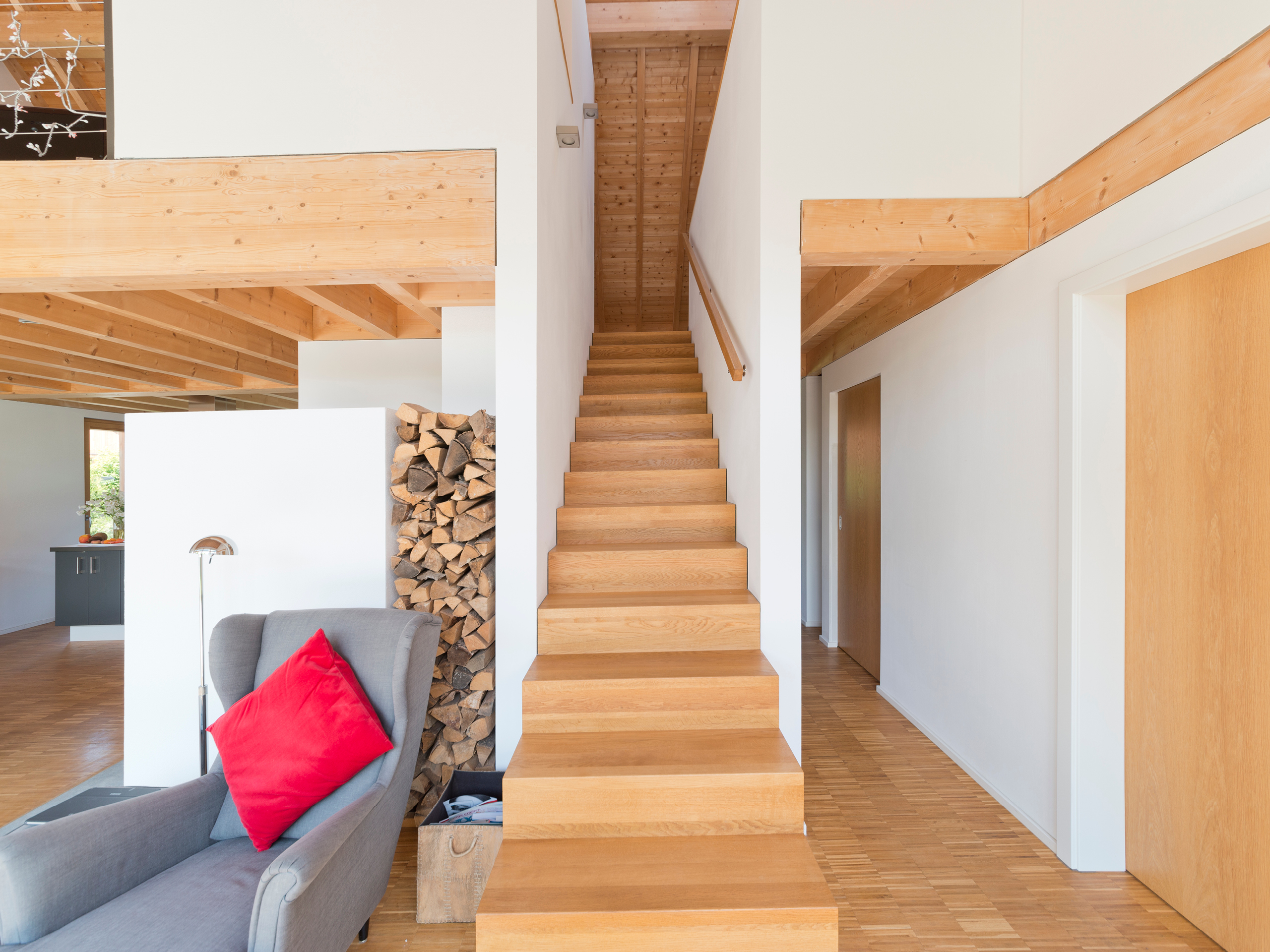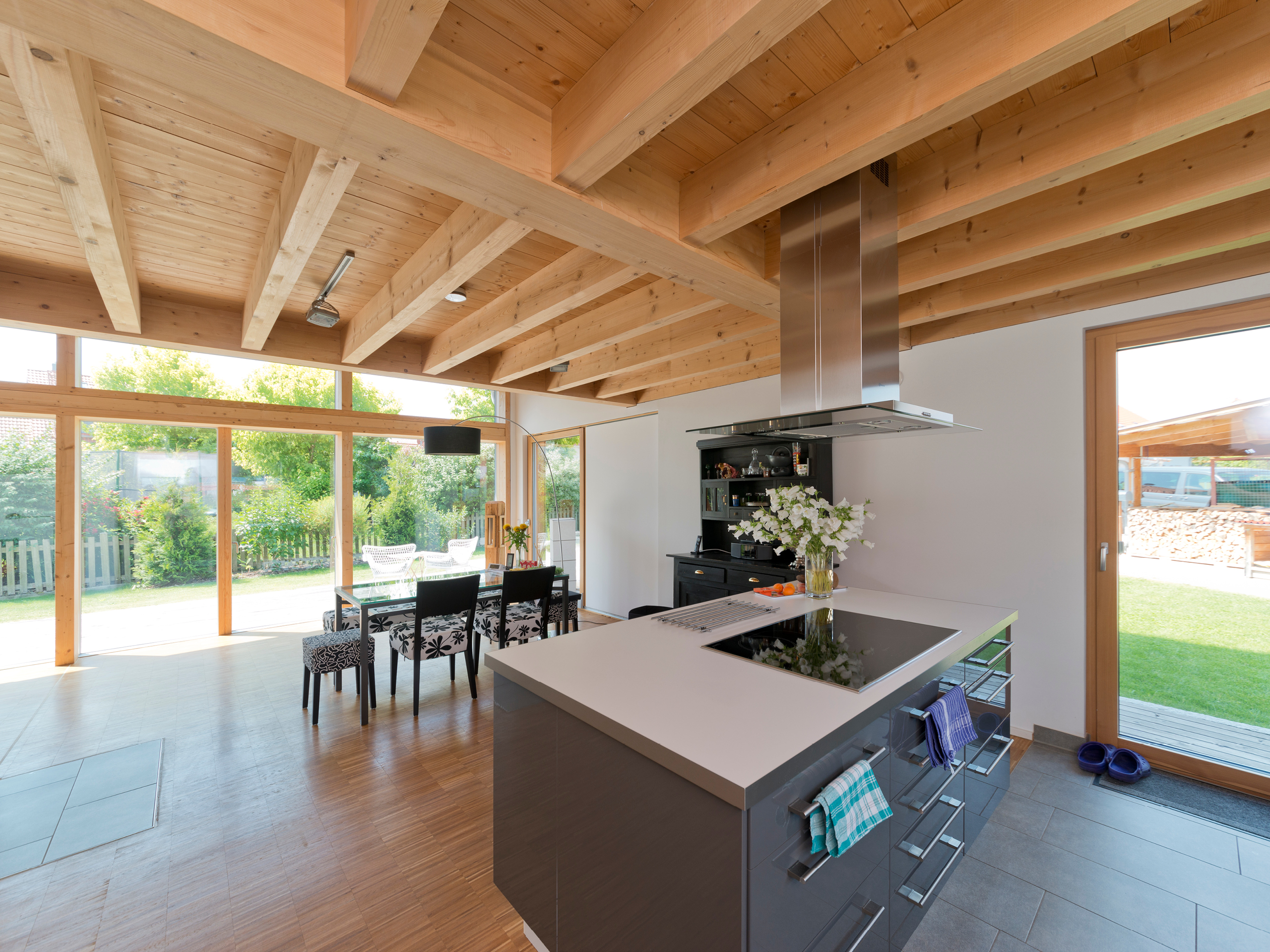 Damit dieses Konzept aufgeht, muss der Baukörper des Hauses gut gedämmt sein. Hier sind die Bewohner auf der sicheren Seite: Die Wandvariante mit Zellulosedämmung und Holzweichfaser-Außendämmung, die sie sich aus dem Angebot der ZimmerMeisterHaus-Manufaktur herausgesucht haben, legte mit einem U-Wert von 0,17 W/m2K die Basis für ein Effizienzhaus-55.