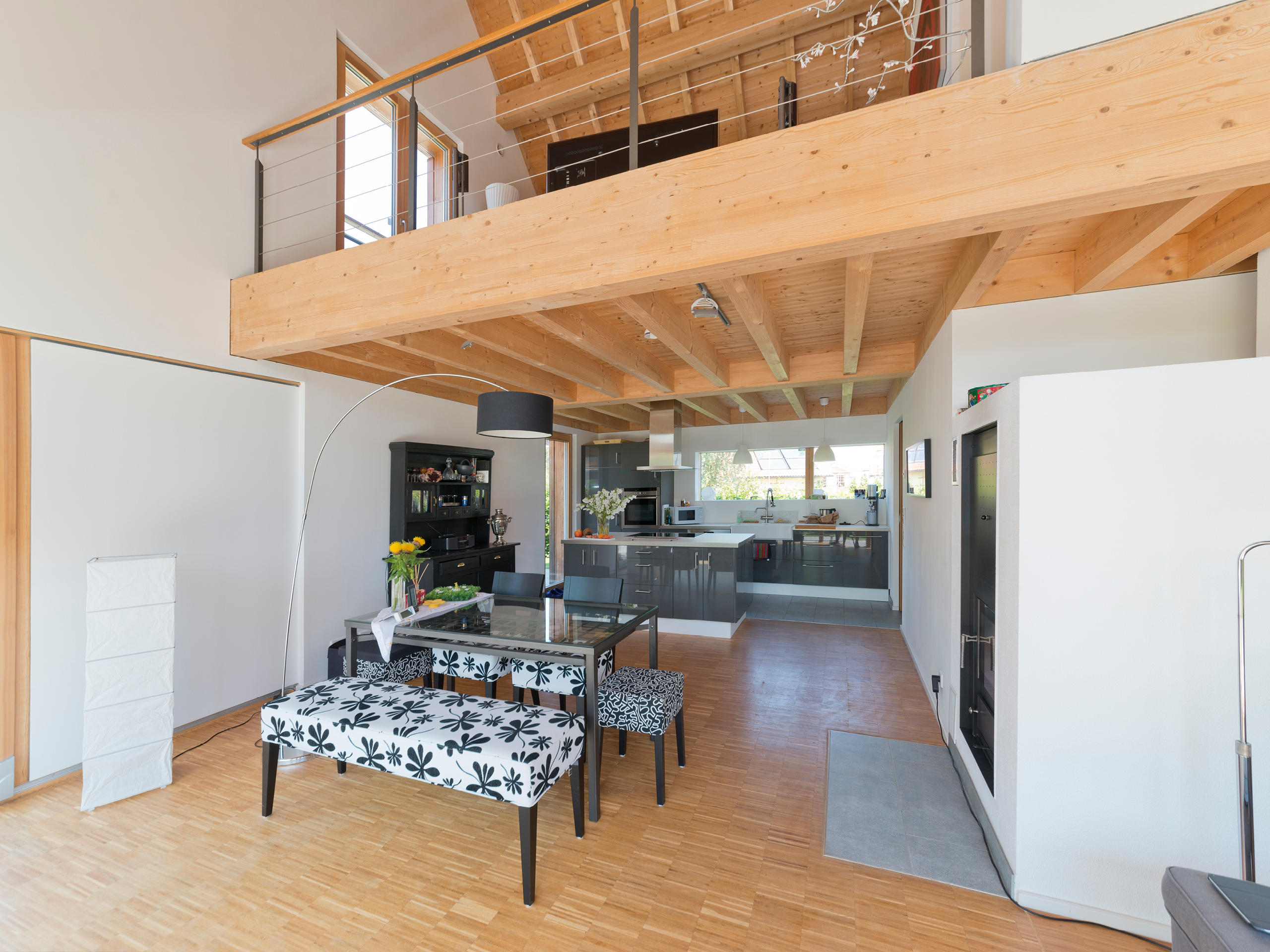 Kern des Wohnkonzepts ist ein auf zwei Ebenen verteiltes Wohnensemble mit Galerie: Unten befinden sich die Küche und ein offener, heller Essplatz, oben der Wohnbereich, bis unter den First offen und über einen französischen Balkon, ein Dachfenster und ein Lichtband im Zwerchgiebel belichtet. Diese Wohngalerie gehört zu den Bereichen, die das Ehepaar besonders zu schätzen weiß – umso mehr, als der Weg zu Schlafraum und Bad kurz ist und man sich dabei nur im geschützten Bereich bewegt.