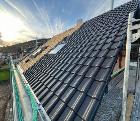hier werden dann 4 Stk. Dachflächenfenster platziert, die Giebel sowie der Schornstein mit Stehfalztechnik bekleidet und die Dacheindeckung selbst erfolgt mit Tonziegeln unseres langjährigen Partner Creaton.