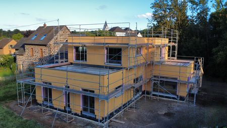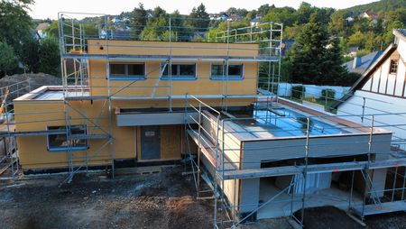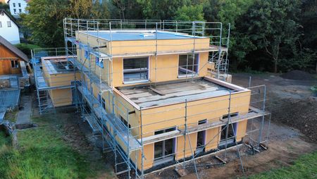 Unser Leistungsumfang beinhaltet hier die komplette Gebäudehülle ab Oberkante Bodenplatte incl. Flachdacheindeckung, Fenster- und Raffstoreanlage, Außenputz sowie Lieferung des Trockenbaumaterial.