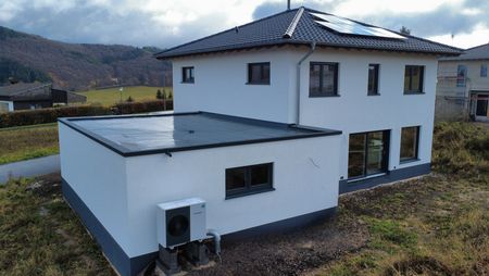 Unser Leistungsumfang beinhaltet hier die komplette Gebäudehülle ab Oberkante Bodenplatte incl. Steil- und Flachdacharbeiten, Fenster- und Rollladenanlage, Außenputz, sowie der Trockenbauleistungen.